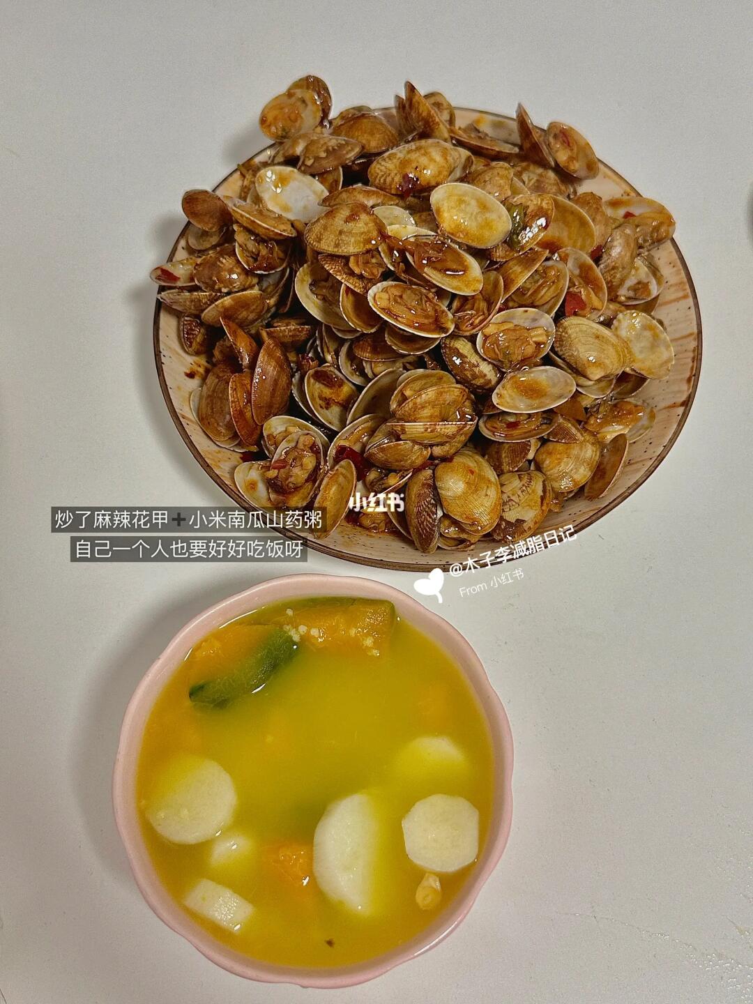 初始体重:120斤 近日体重:93斤 目标:80斤 -今日饮食: 早:肉松咸蛋黄贝果➕蓝莓➕滑蛋➕肉肠➕黑咖啡 午:炒牛肉➕米饭➕豆腐裙带菜汤 加:马斯卡彭拿铁 晚:麻辣花甲➕小米南瓜山药粥 喝水2000ml 运动🈚 💭今日碎碎念: 一个人在家的饮食 简简单单 清清爽爽~吃好喝好不想家😜