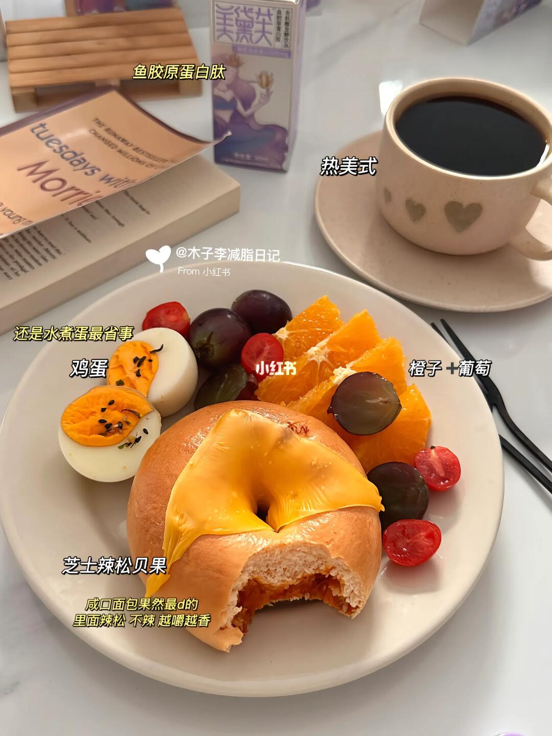 🥣早:芝士辣松贝果 | 胶原蛋白肽 | 鸡蛋 | 葡萄 | 橙子 | 热美式