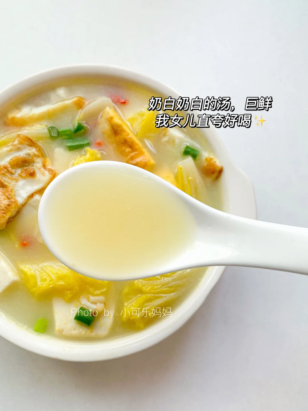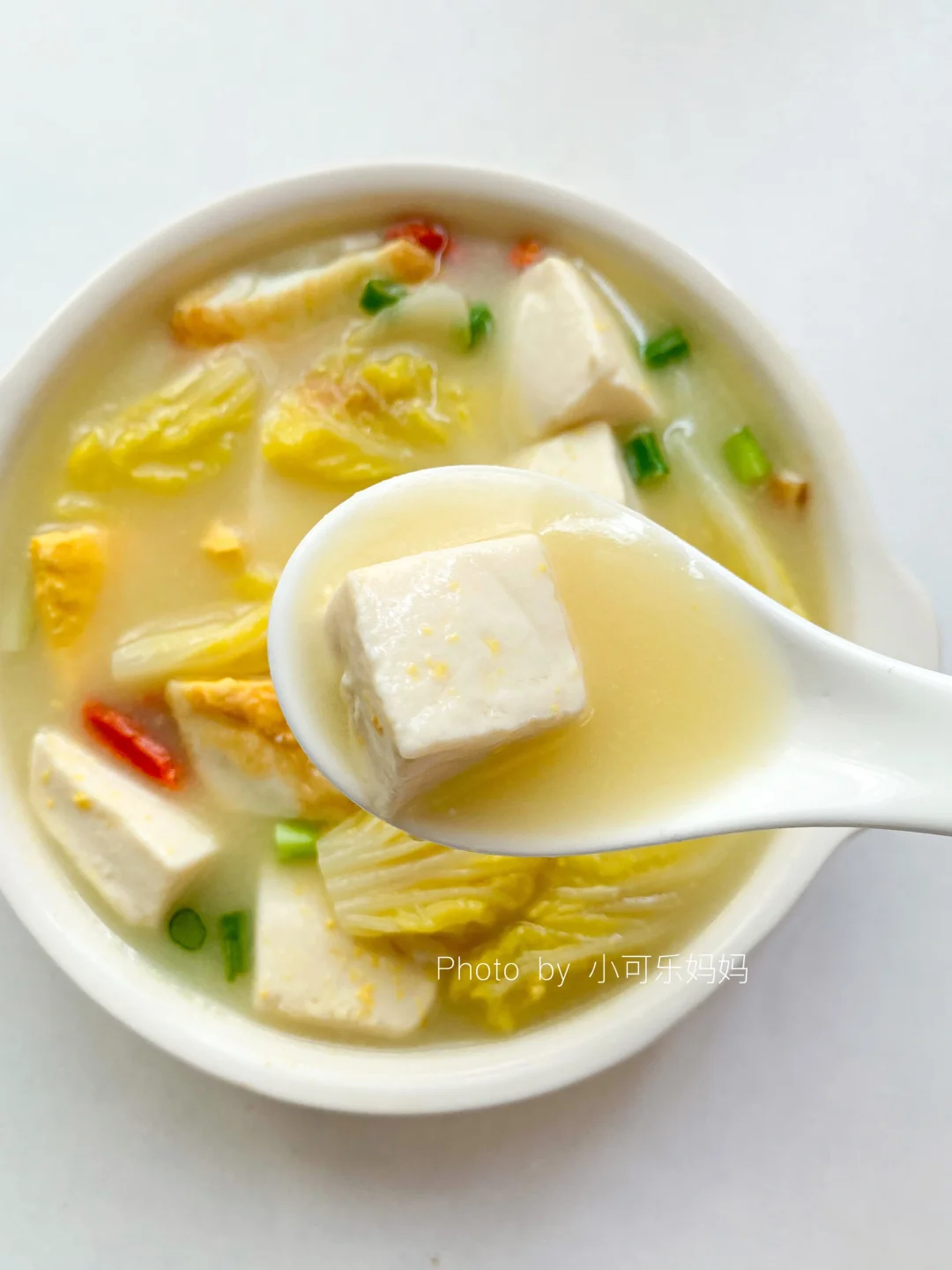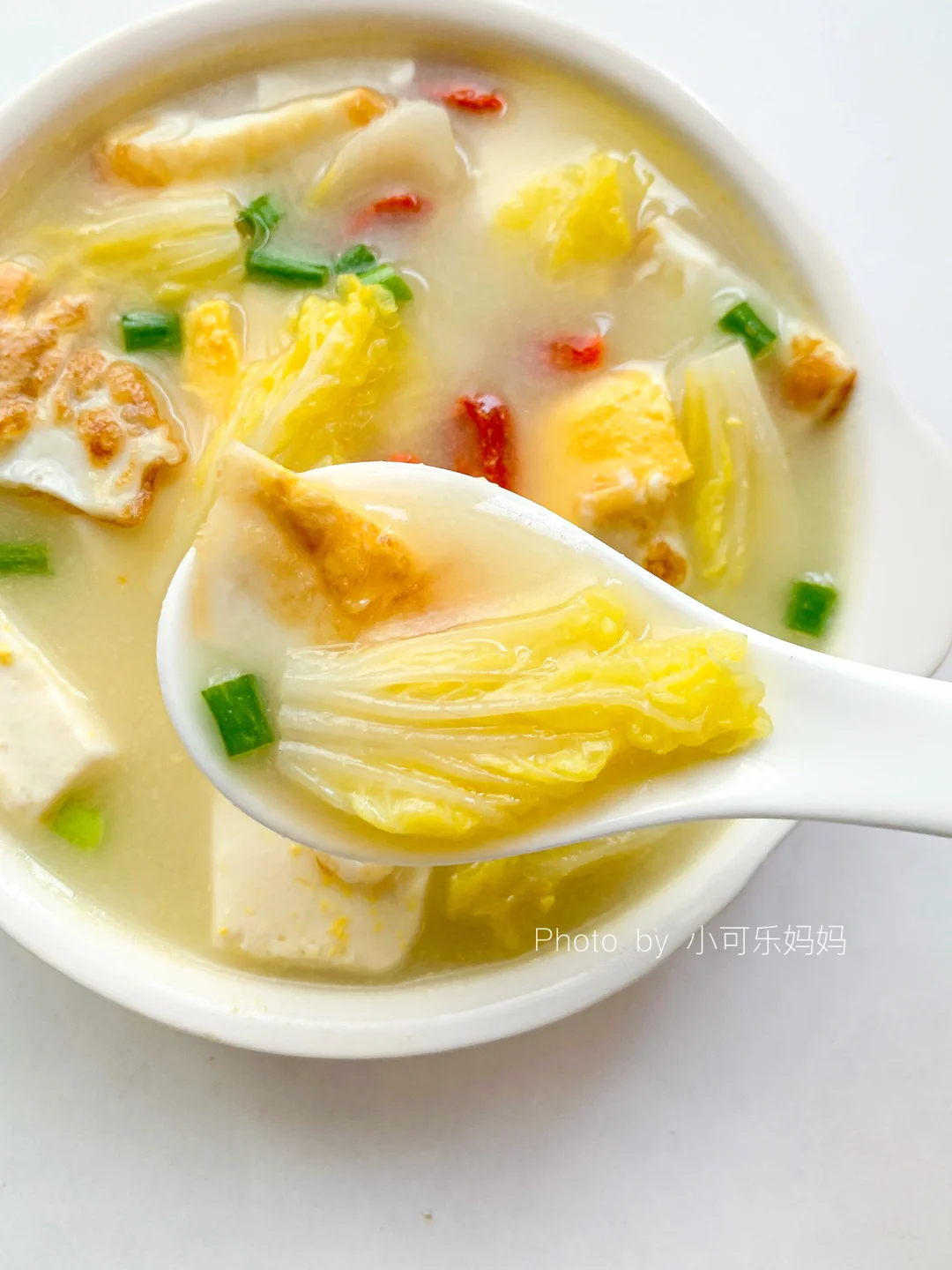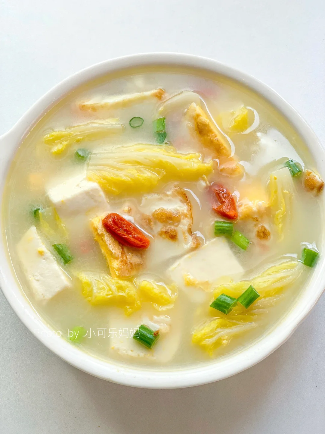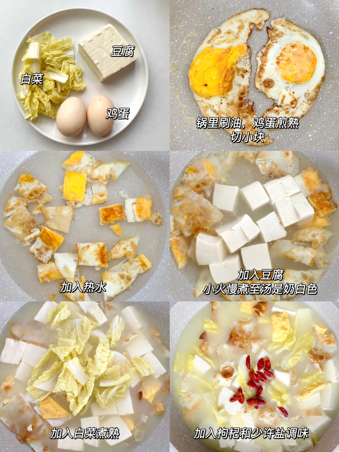 天气太热了,宝宝没胃口,今天分享给大家这个白菜煎蛋豆腐汤,汤汁奶白奶白的,白菜鲜甜可口好吃,还可以清热去火,豆腐嫩滑补钙,煎蛋吸饱汤汁,真的太鲜美了,厨房小白也可以轻松搞定 - 🥣食材: 白菜 嫩豆腐 鸡蛋 枸杞(可不放) - ✅做法简单,10分钟轻松搞定!减脂期的家人们也可以冲冲冲 ✅食材大小可根据宝宝咀嚼能力调节,一岁以下宝宝不加调味