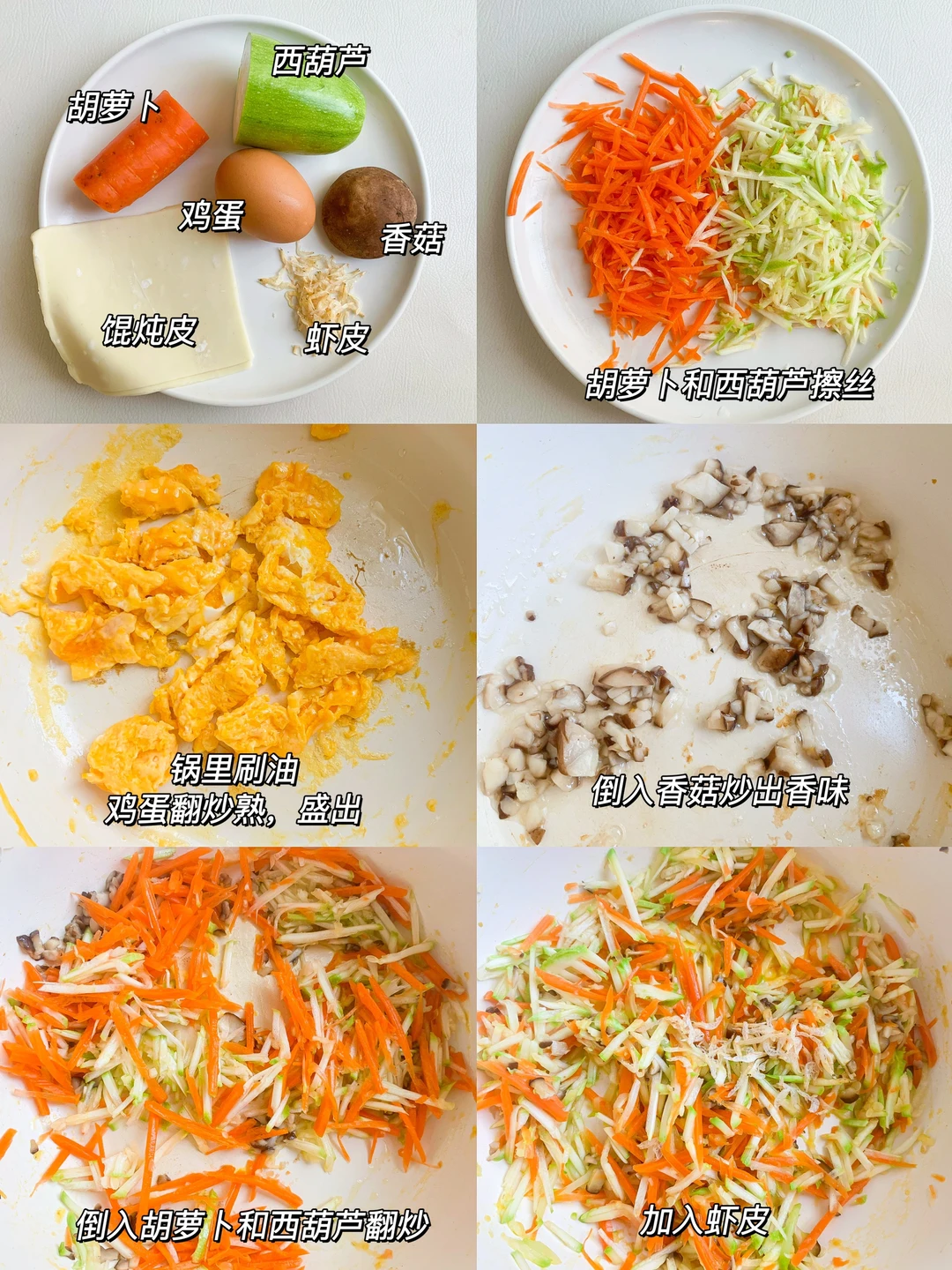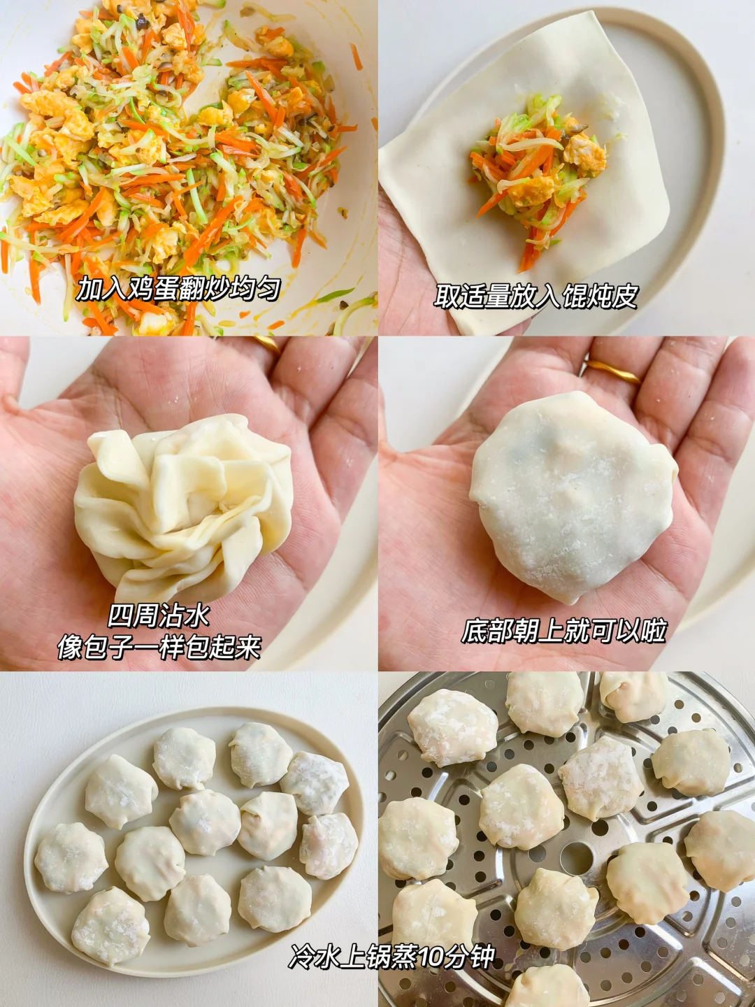 今天分享可乐爱吃的蔬菜小蒸包,软嫩鲜香,皮薄馅大,不爱吃蔬菜的宝宝一定要试试,不用揉面,不用擀皮,做法简单,快给宝宝安排上吧 - 🛒食材 西葫芦 胡萝卜 鸡蛋 馄炖皮 虾皮 香菇 . 👩🍳做法 1⃣️鸡蛋打散炒熟弄碎,另起锅放入香菇翻炒,加西葫芦胡萝卜丝炒至变软加入鸡蛋碎、虾皮搅拌均匀 2⃣️取一张馄炖皮皮放上馅料像包包子一样包口收紧底部朝上就包好啦~ 3⃣️冷水上锅蒸10分钟即可~ 🌈1岁宝宝以上加盐或酱油调味 🌈食材大小根据宝宝咀嚼能力处理~
