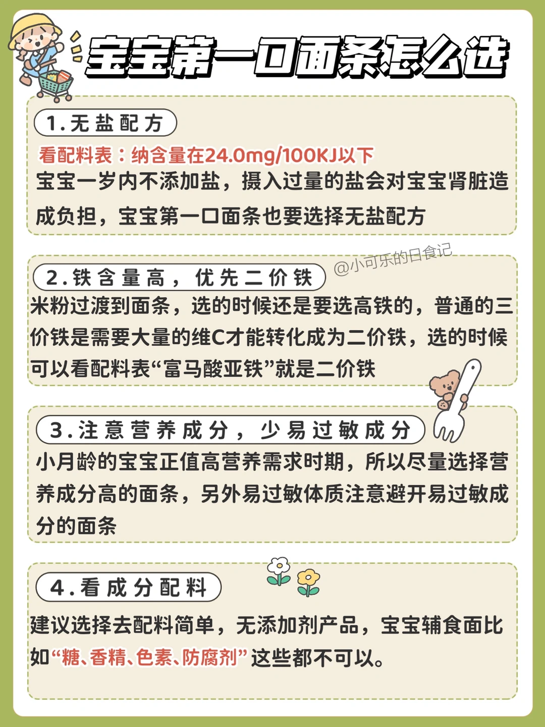 成人面条的钠含量高也没有维生素和钙铁锌,并且添加有盐和其他添加剂,1岁内建议还是吃符合婴标的宝宝面条
