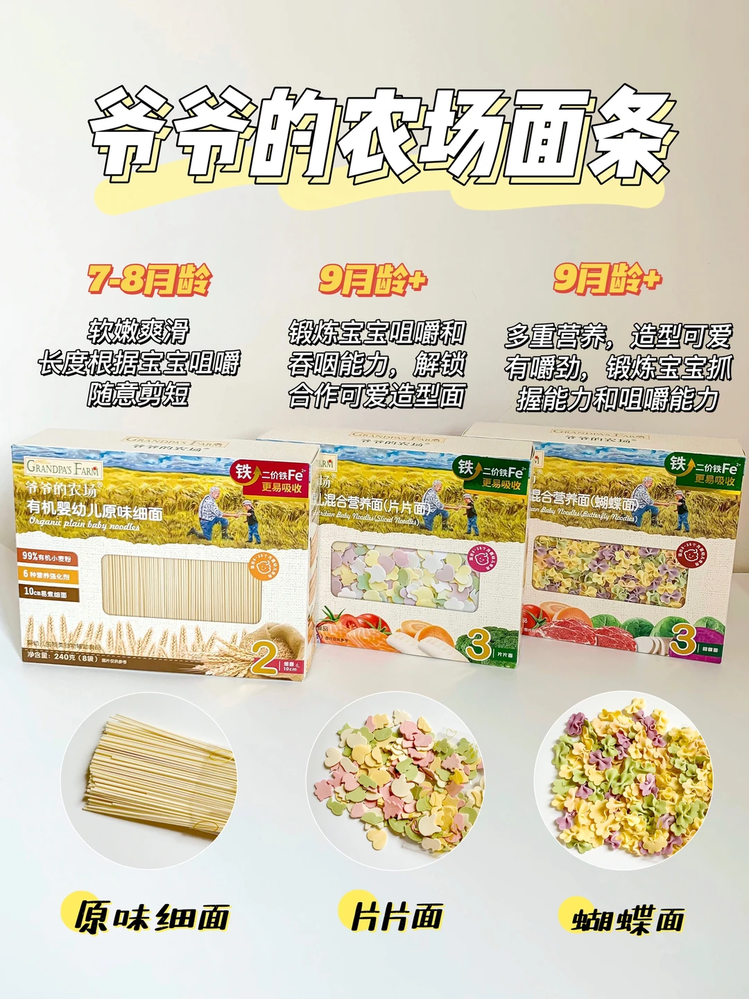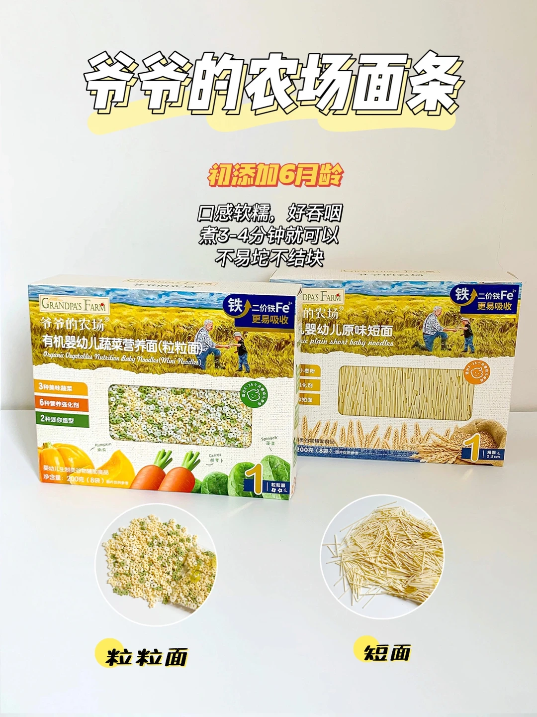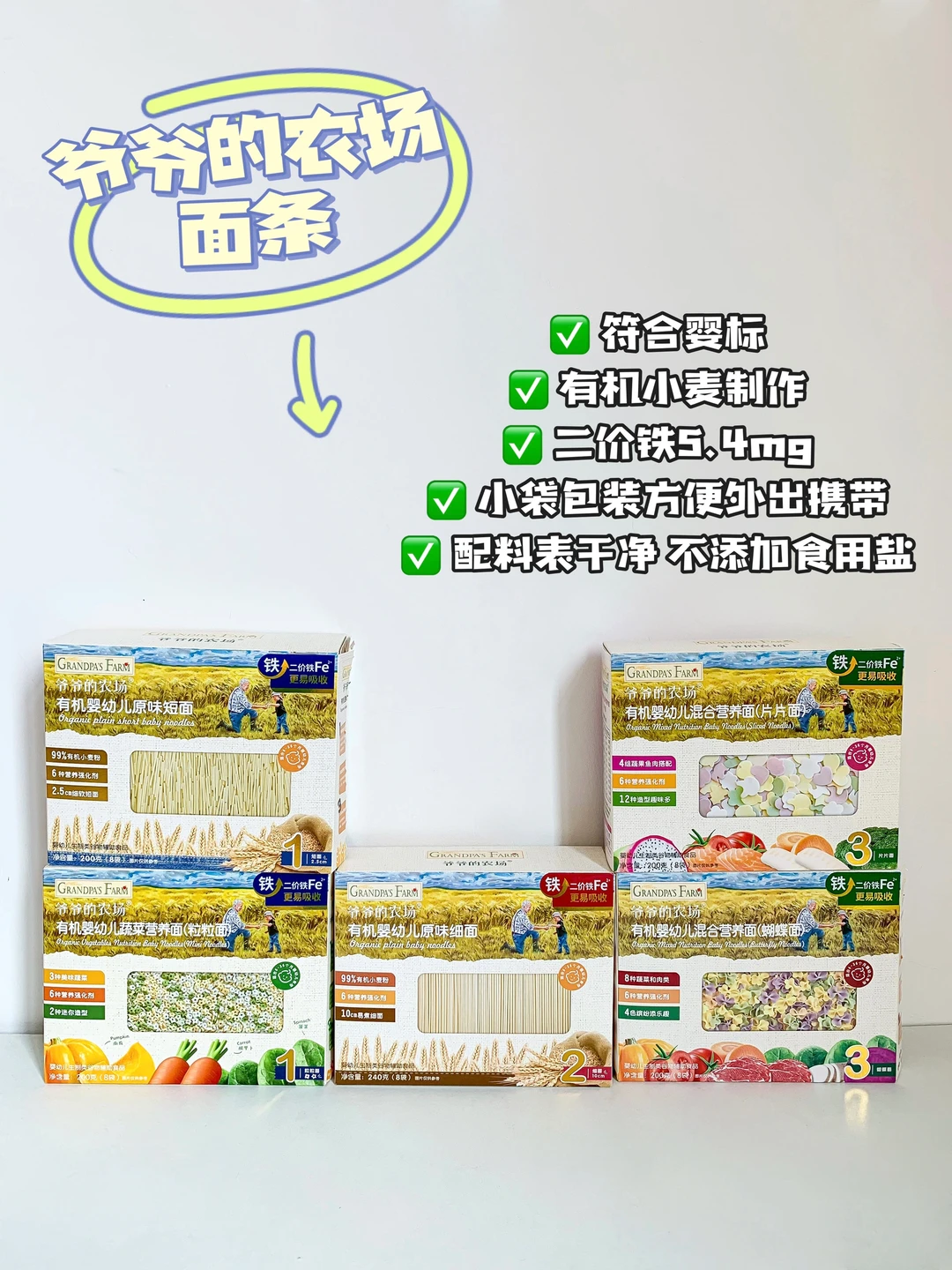 我给可乐吃的是爷爷的农场面条,他们家的面条种类多,对新手爸爸妈妈来说真的太友好了,不同月龄的不同造型都有,我这次入了短面、粒粒面、长直面、片片面、蝴蝶面,造型可爱,也很好煮,搭配一些肉泥、菜泥,宝宝就很爱吃。他家的面条配料表很干净,不添加食用盐,铁含量高达5.4mg,还是二价铁,原料还是有机小麦,每盒都是独立小包装,卫生又方便,出门携带也很方便~