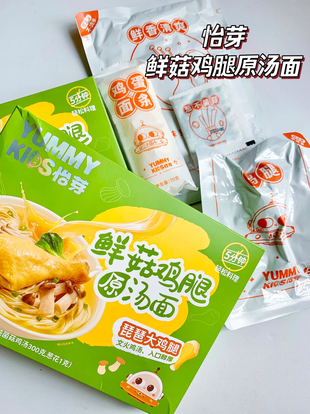 今天煮的是怡芽家的鲜菇鸡腿原汤面,有汤有肉都是搭配好的,一整个大鸡腿,太感人了,肉很软嫩一点也不柴,和以前买过的其他肉类速食口感完全不同。小朋友一咬完全脱骨,但而不是烂成肉糜,很适合小朋友拿着啃!汤汁也很鲜甜,面条细软好咀嚼,轻松搞定一餐。搭配了可乐爱吃的芝士猪猪肠,肉足有嚼劲,大颗肉粒分明可见,而且自带芝士,增加了奶香,营养又好吃,宝宝很喜欢
