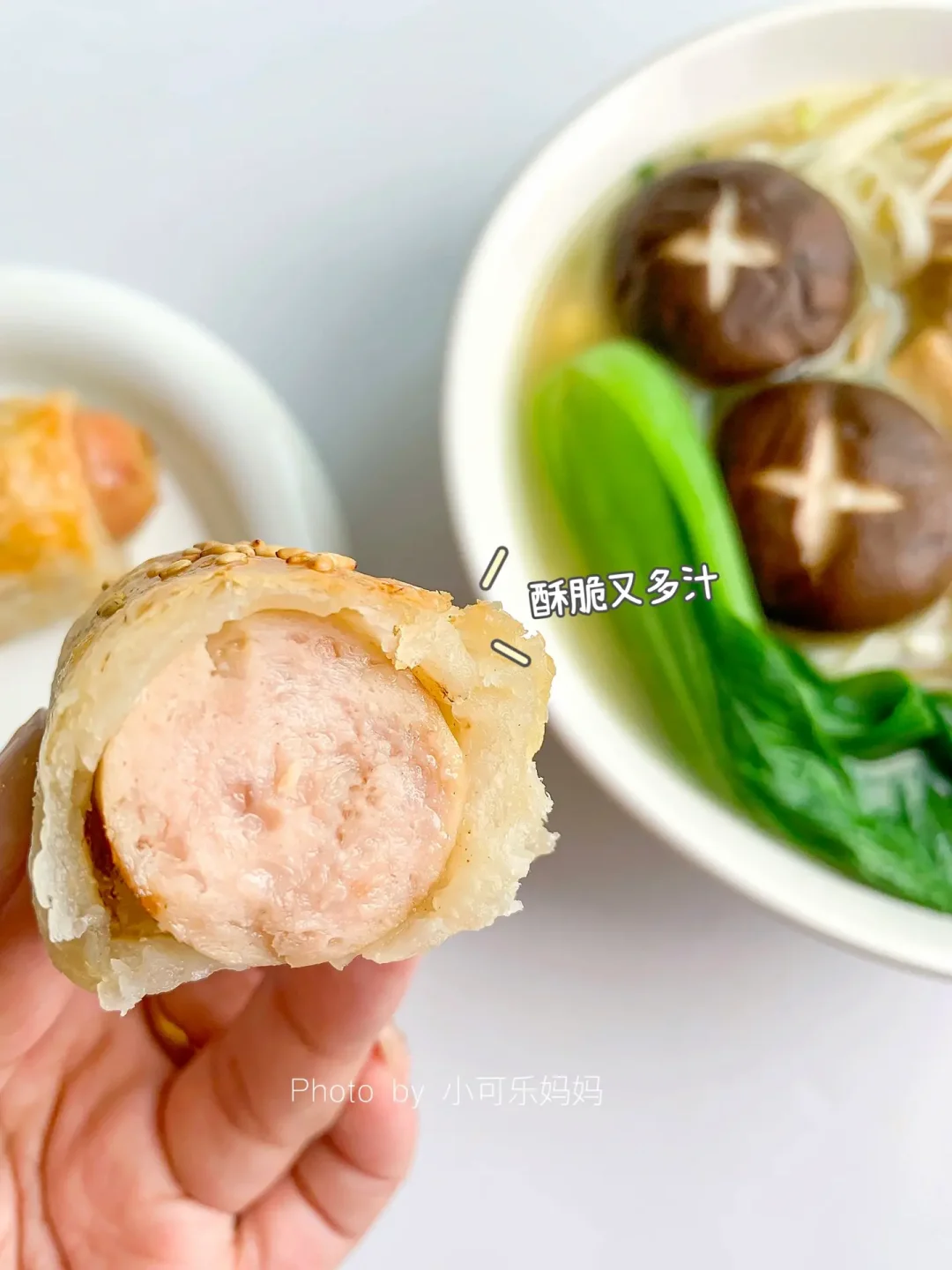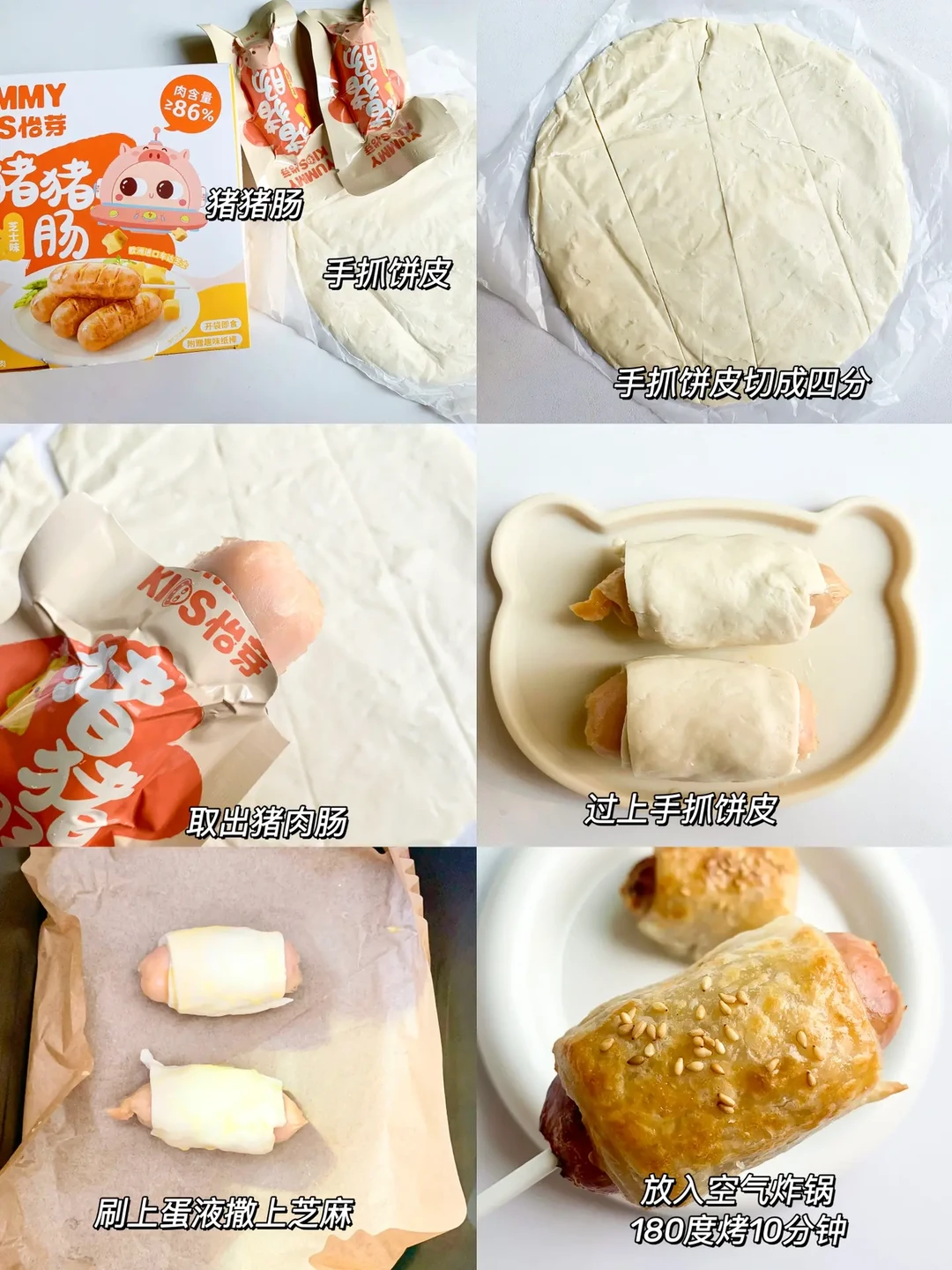 1⃣️手抓饼皮切成四份,取出猪肉肠