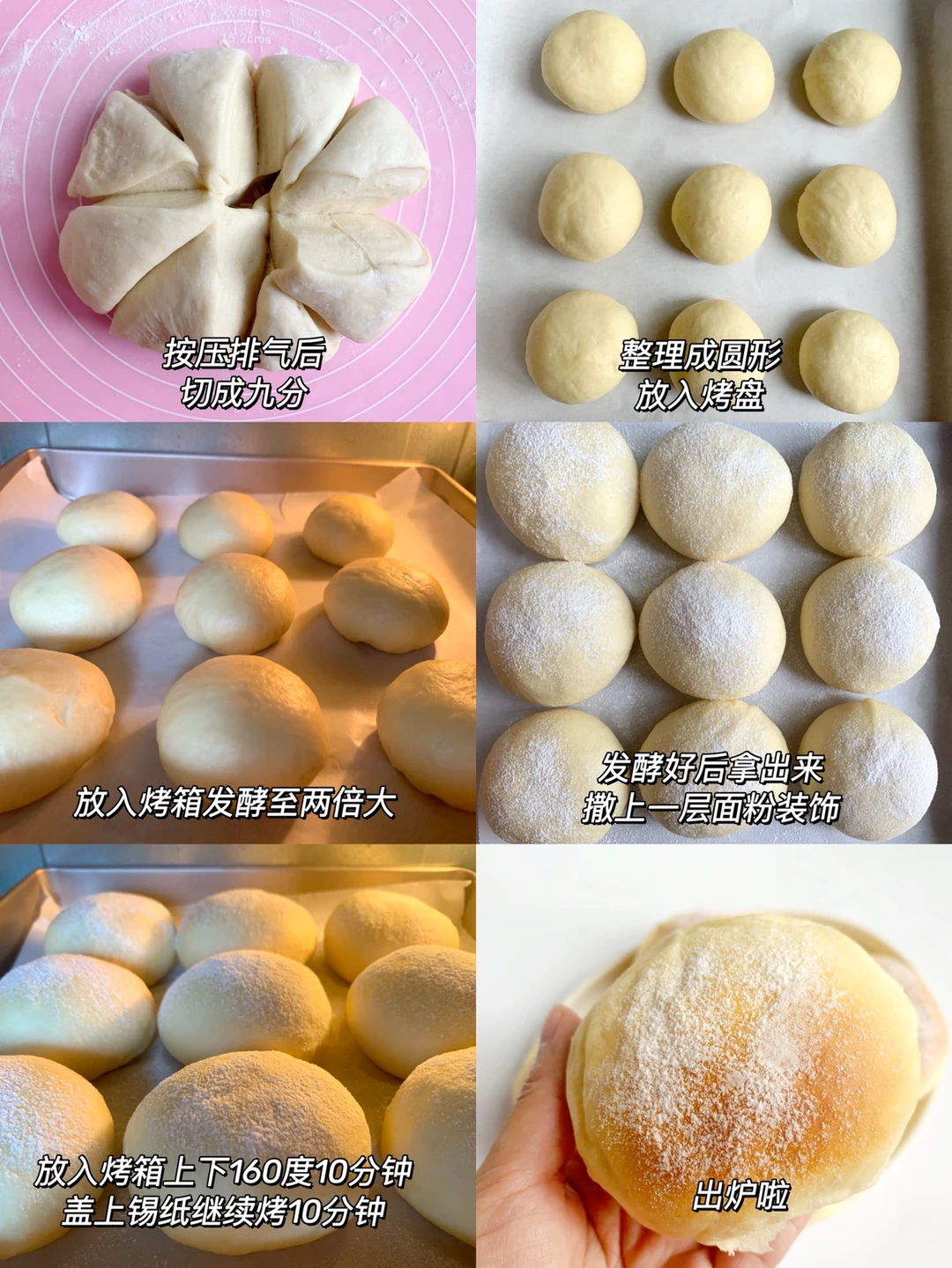 3⃣️拿出按压排气,平均分为9 份,整理成圆,放入烤盘,烤盘需提前铺油纸。