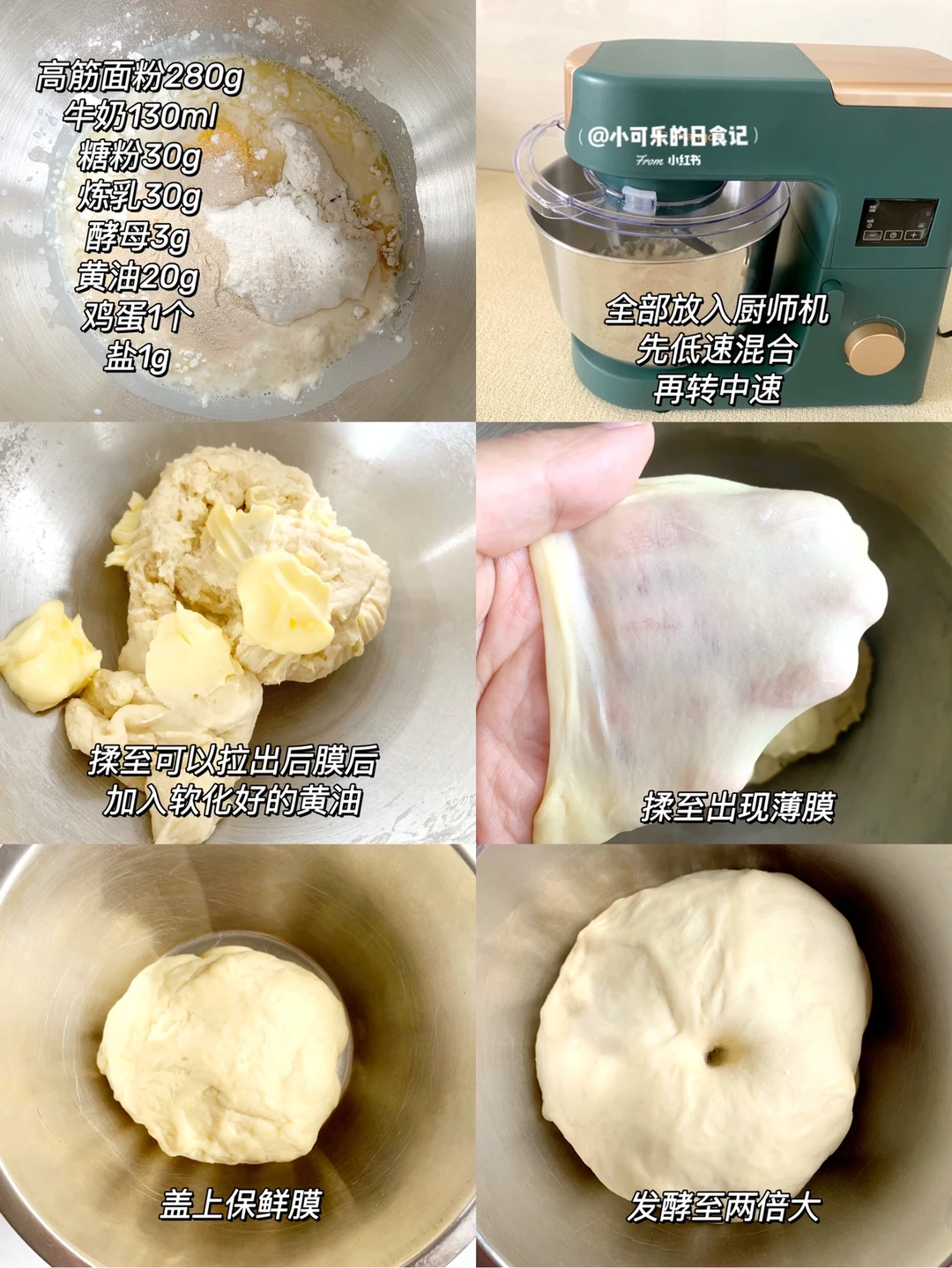 1⃣️将除黄油外的所有材料加入厨师机中,先低 速混合,再调至中速,揉至可以拉出厚膜,加入黄油继续揉面,一样先低速混合再中速,最后转高速,揉出手套膜