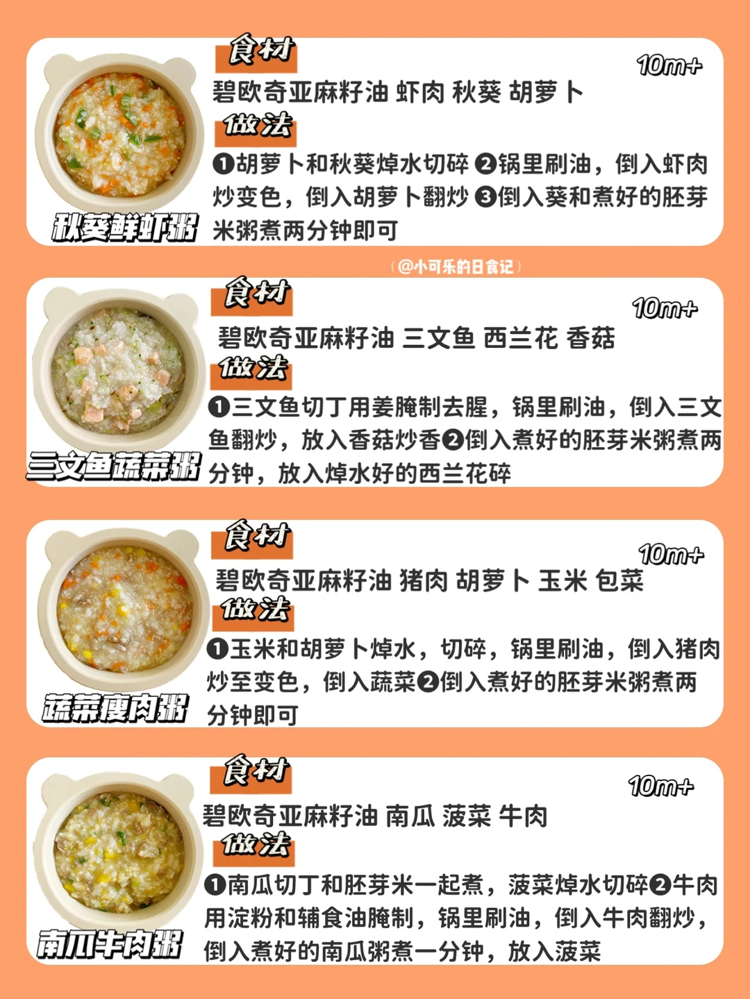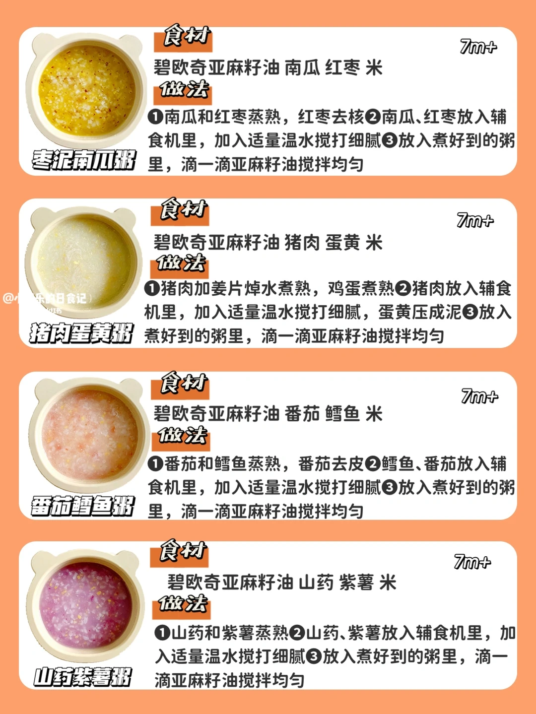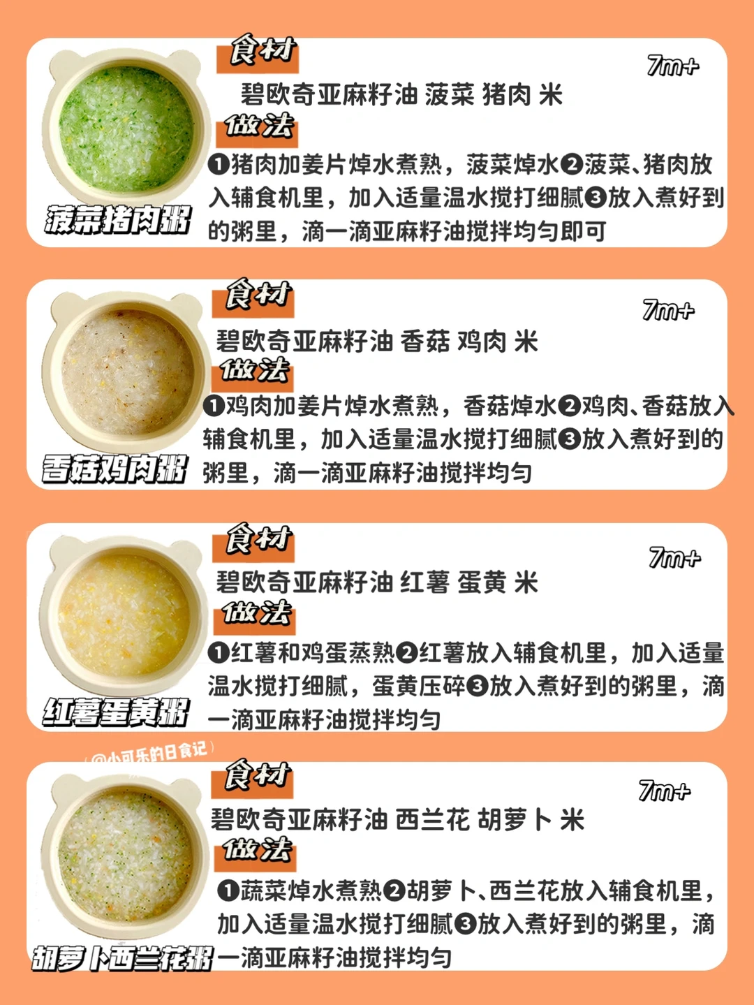 ✔️这些搭配都是我觉得比较好吃的,7月龄宝宝刚添加粥需要从比较简单的搭配开始,食材再慢慢多样化,做法都在图片上。食材大小根据宝宝咀嚼能力处理