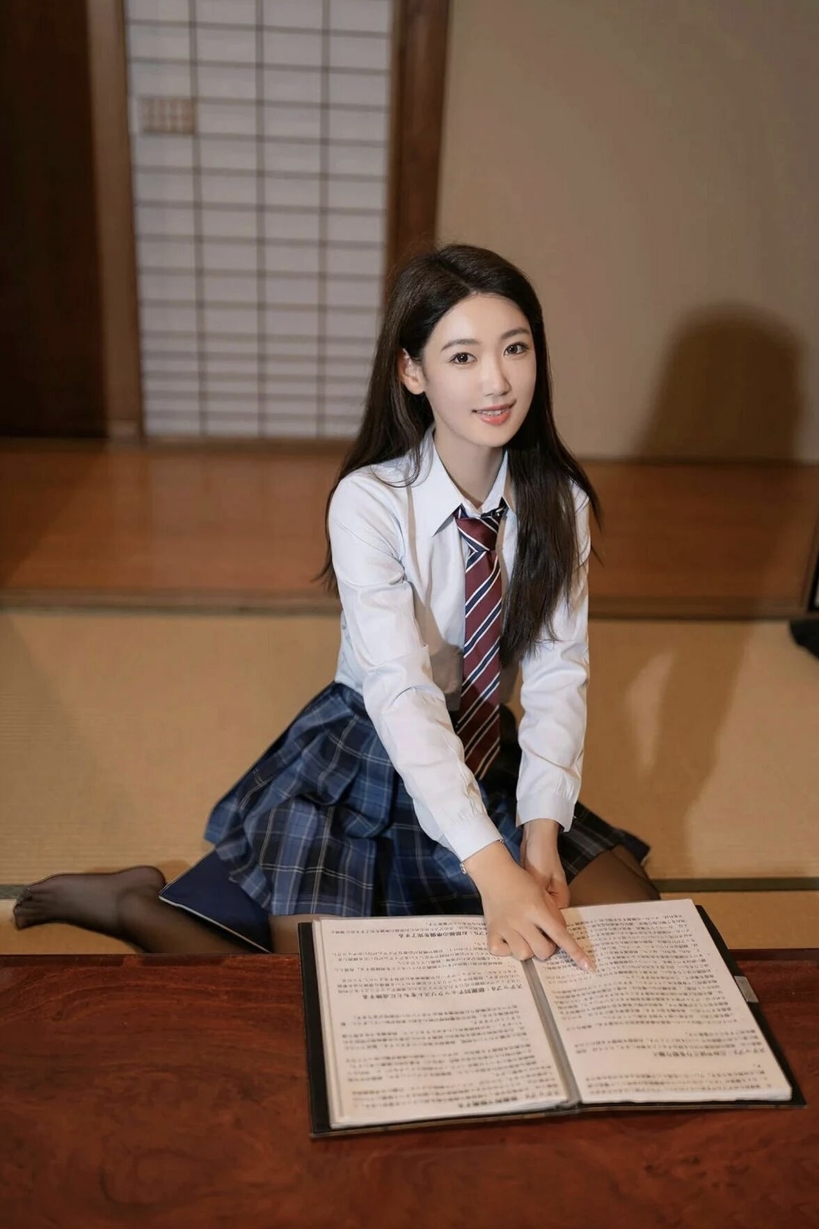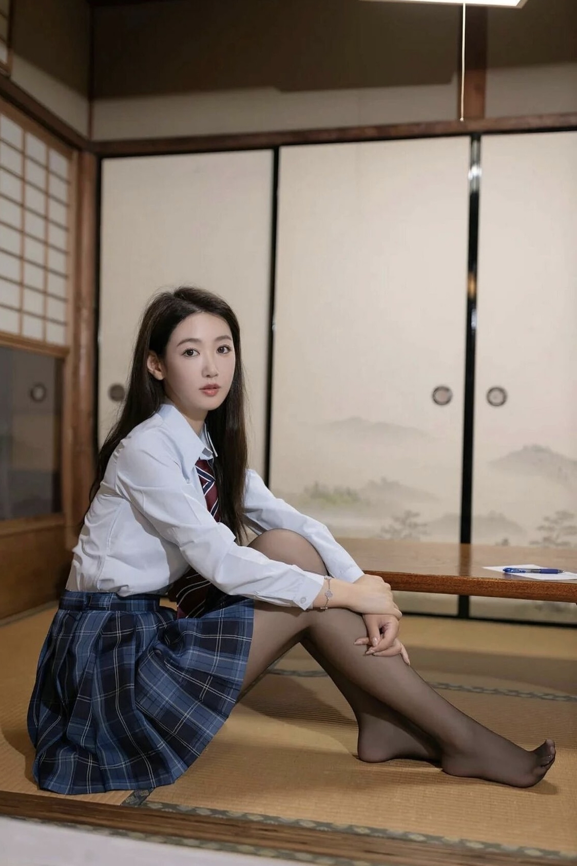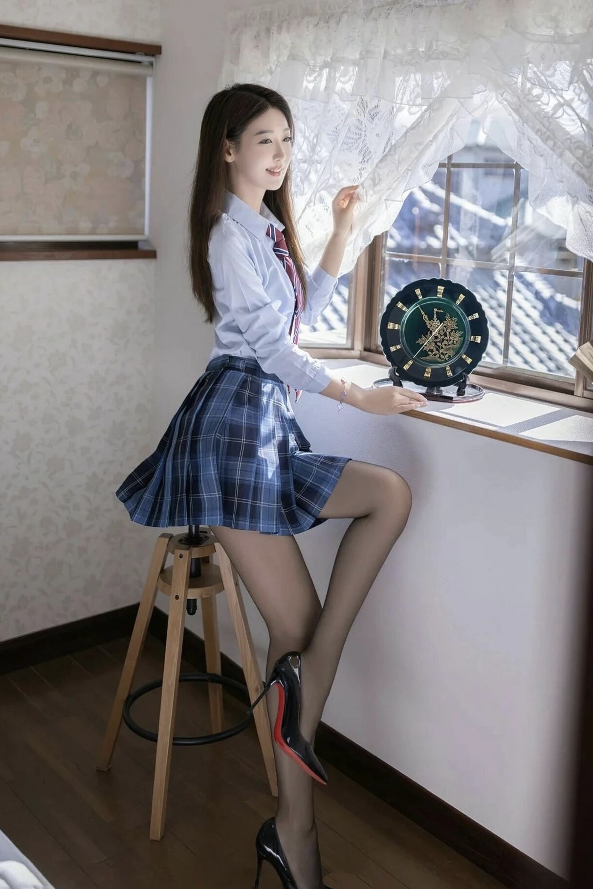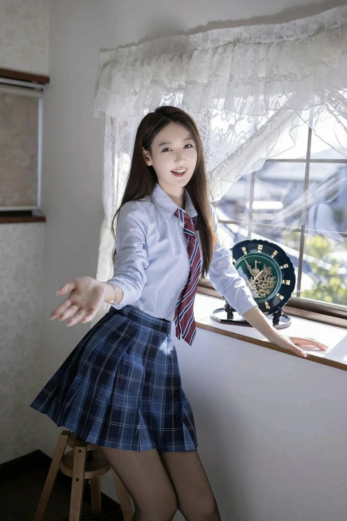 JK制服|唐安琪 JK穿搭也太戳少女心了!浅蓝衬衫搭配深蓝格裙,色调清爽又温柔,领带添了俏皮感,修长美腿裹在丝袜里,把清纯甜美与青春活力揉得刚好。窗边浅笑的姿态温婉又楚楚动人,像把夏日的柔风都揉进了画面里,甜得让人移不开眼。jk青春感穿搭 JK风短裙 甜系jk女孩 治愈系少女写真怎么拍jk漫画感穿搭 唐安琪 长腿女神唐安琪 黑丝袜美腿 长腿控 jk穿搭
