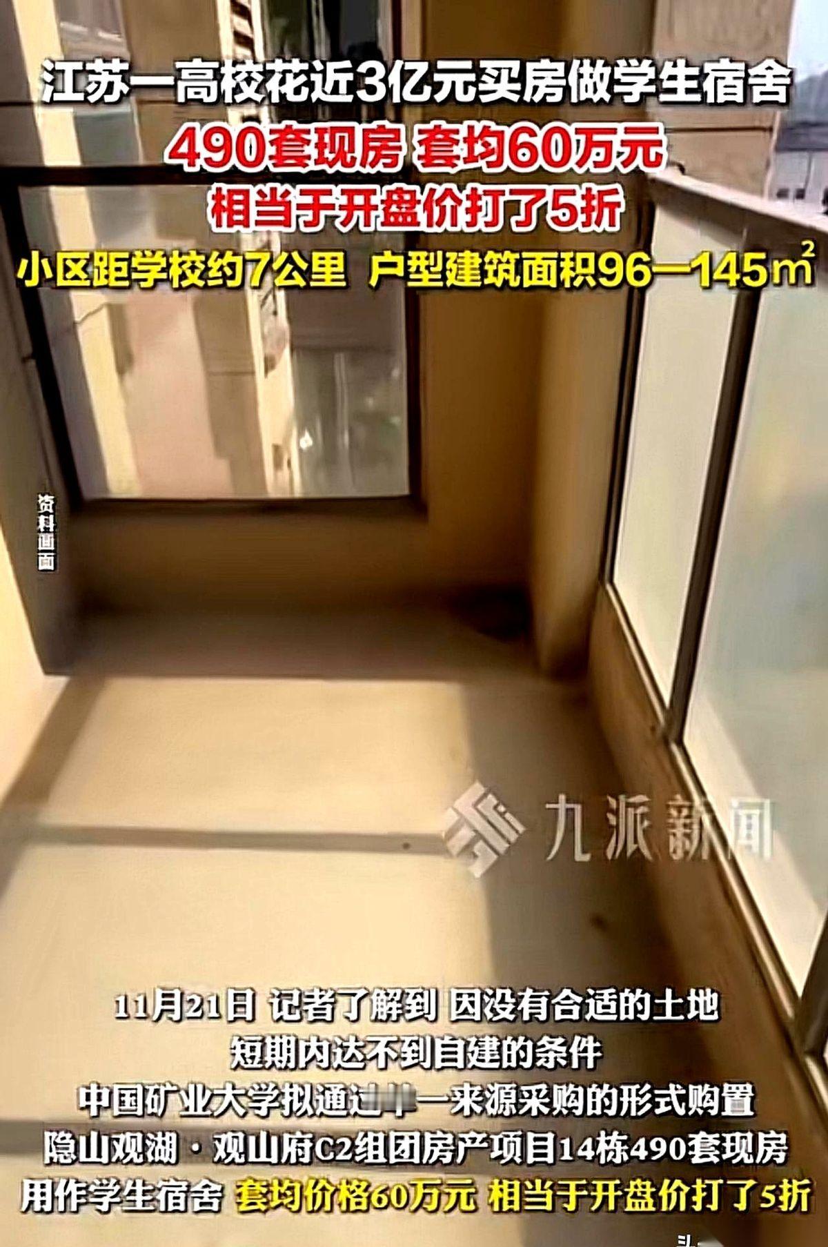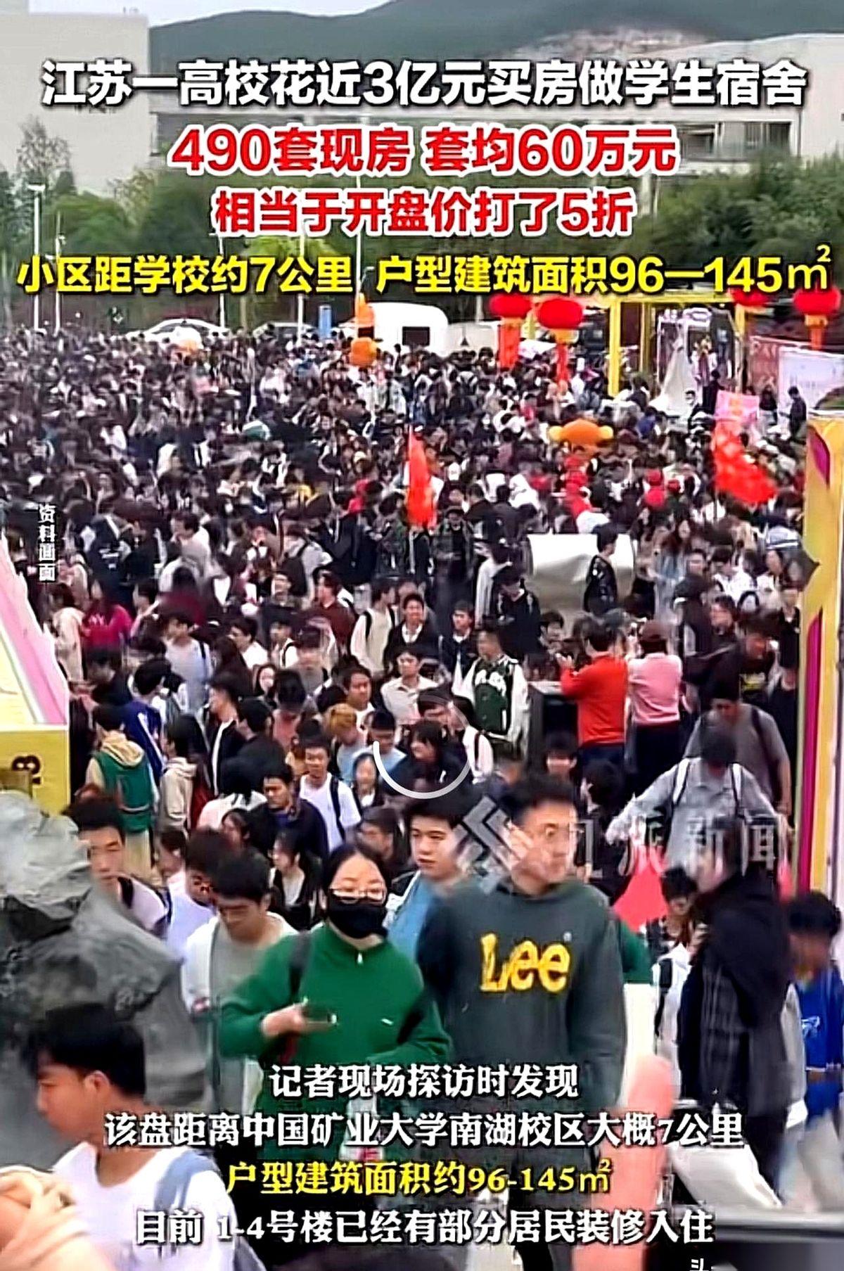 将近3个亿,一口气拿下490套商品房,就为了给学生当宿舍。 而且是现房。 而且是开发商标价的五折。 很多人第一反应是:这学校真有钱,真豪横。 错了。我跟你说,这不叫有钱,这叫“会过日子”,是顶级的精明。 你想想,按老规矩,学校要盖宿舍楼,得走多少流程?拿地、审批、招标、基建……一套组合拳下来,钱没少花,时间至少两三年。学生呢?只能继续挤着。 现在呢? 一锤子买卖。 开发商手里卖不出去的房子,正好,我打包收了,你快速回笼资金,我解决了燃眉之急。 学生住宿问题,解决了,住的还是正儿八经的两室一厅、三室一厅,比鸽子笼舒服多了。 学校的钱,花在了刀刃上,还享受了“骨折”价,里子面子全赚了。 一件事,干成了三件事的效果。 盘活了存量,解决了民生,还省了钱。 这事儿最妙的地方在于,它不是一个大学的“灵机一动”,现在很多地方都在学,都在这么干。 你看,这就叫智慧。 真正解决问题的办法,往往不是声势浩大的口号,而是这种藏在柴米油盐里、谁都看得懂的、朴素的常识。 挺好的。 感觉看到了解决很多“老大难”问题的另一种可能。
