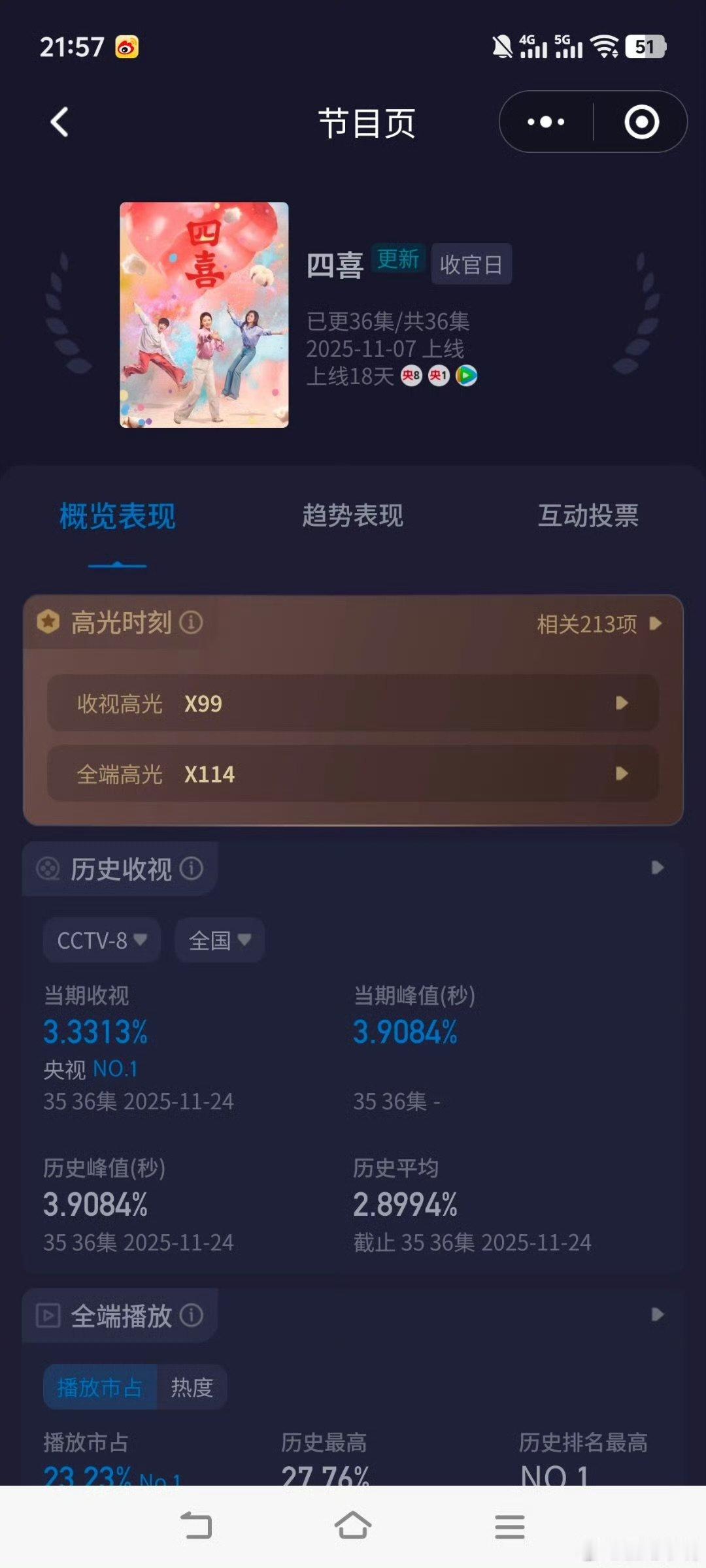 童谣 蒋欣 黄明昊《四喜》今晚迎来大结局!酷云集均2.8994暂列央八年冠!今晚双集走势如下:第一集:起点1.8388,峰值3.9084,平均3.2118第二集:起点3.0125,峰值3.8596,平均3.4570双集平均:3.3313cvb估值:3.3313×0.800=2.665