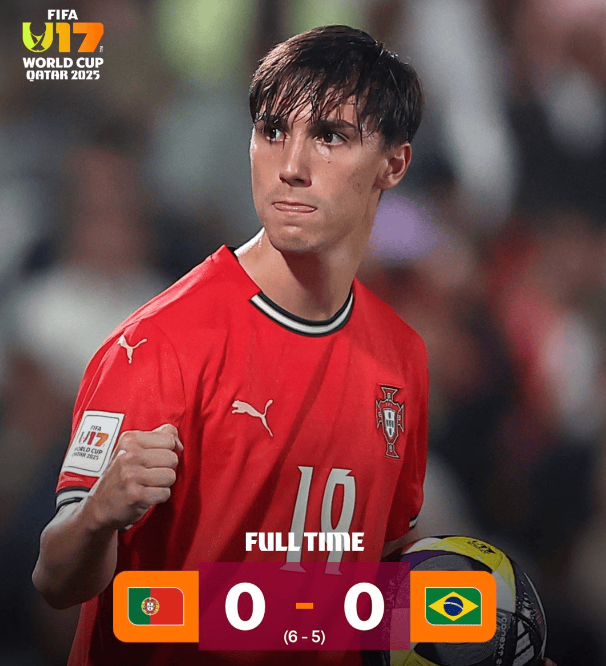 点球大战中,前五轮双方全部罚中,比分来到5比5进入“突然死亡”。第六轮,葡萄牙小将若泽-内托率先罚入,随后巴西新星安吉洛站上点球点,却将皮球射高,葡萄牙以6比5惊险过关,终结了巴西冲击与尼日利亚并列夺冠次数纪录的希望。