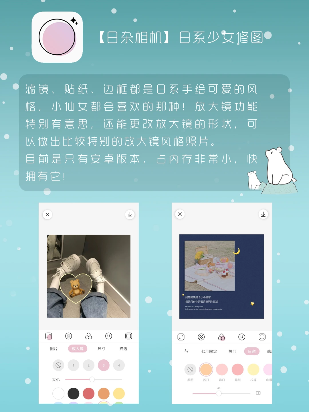 大家好,我是蓝贴贴的办公桌[喝奶茶R][喝奶茶R][喝奶茶R] 悄悄告诉你们,前几天出门被人夸软萌[害羞R][害羞R][害羞R],所以这期就是软软呼呼可爱到犯规的APP合集啦~🧸🧸🧸 颜值要有,实用性也不能丢,都是很好用的我都替你们试过了[斜眼R][斜眼R][斜眼R] 🍉日杂相机 🍓装扮少女 🍉橙 🍓美物清单 🍉克拉壁纸 🍓面包视频 🍉喵喵记账 🍓Folioscope 好吃的东西要吃进肚子里,可爱的人要放在心里💕 所以要把我放在心里!❤和⭐点起来吖~~