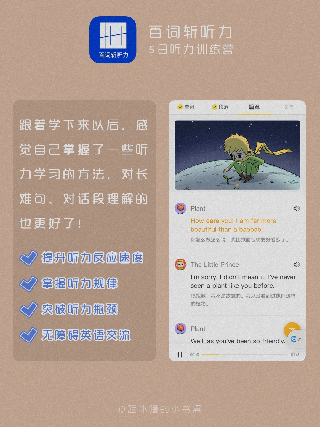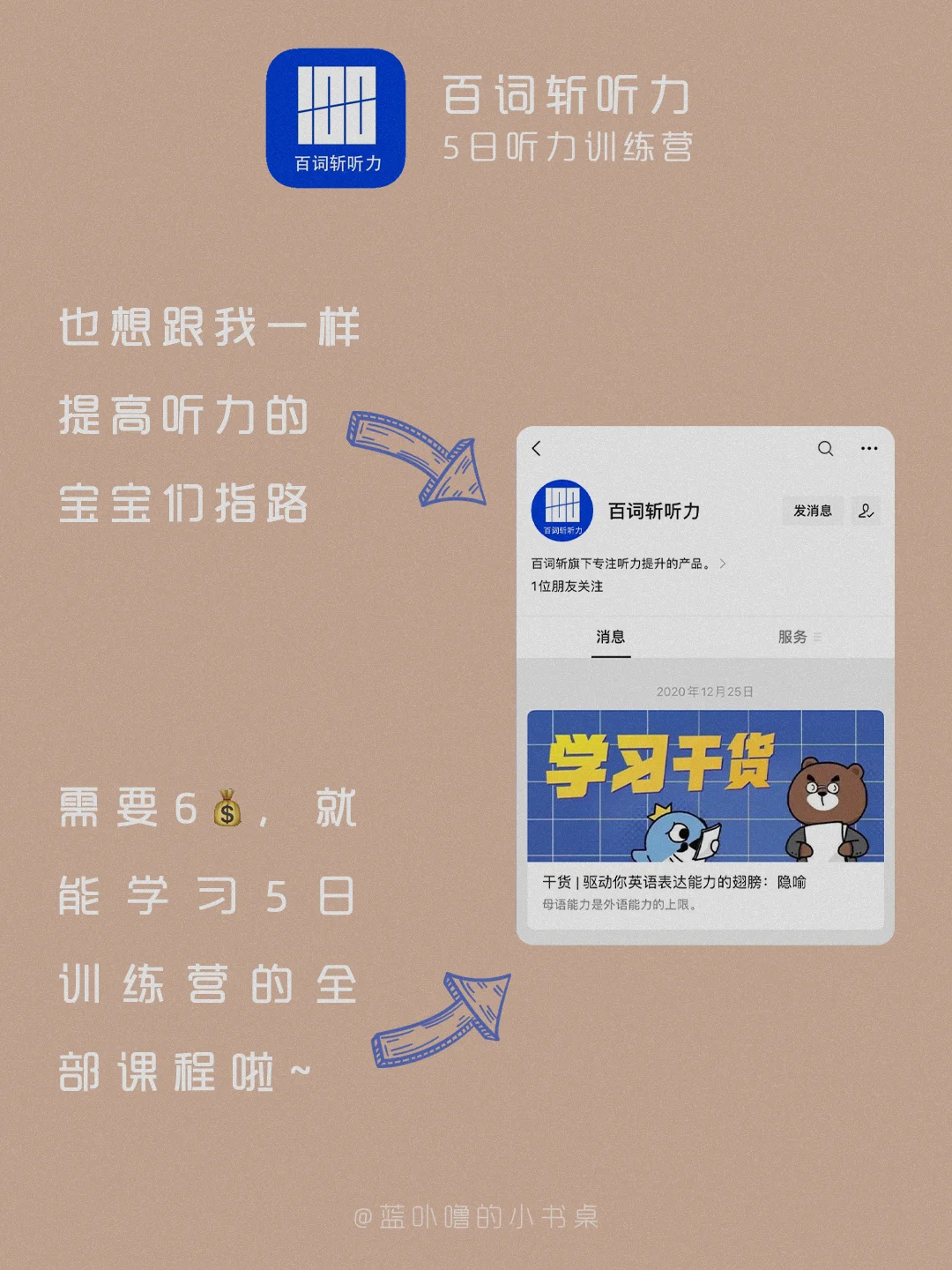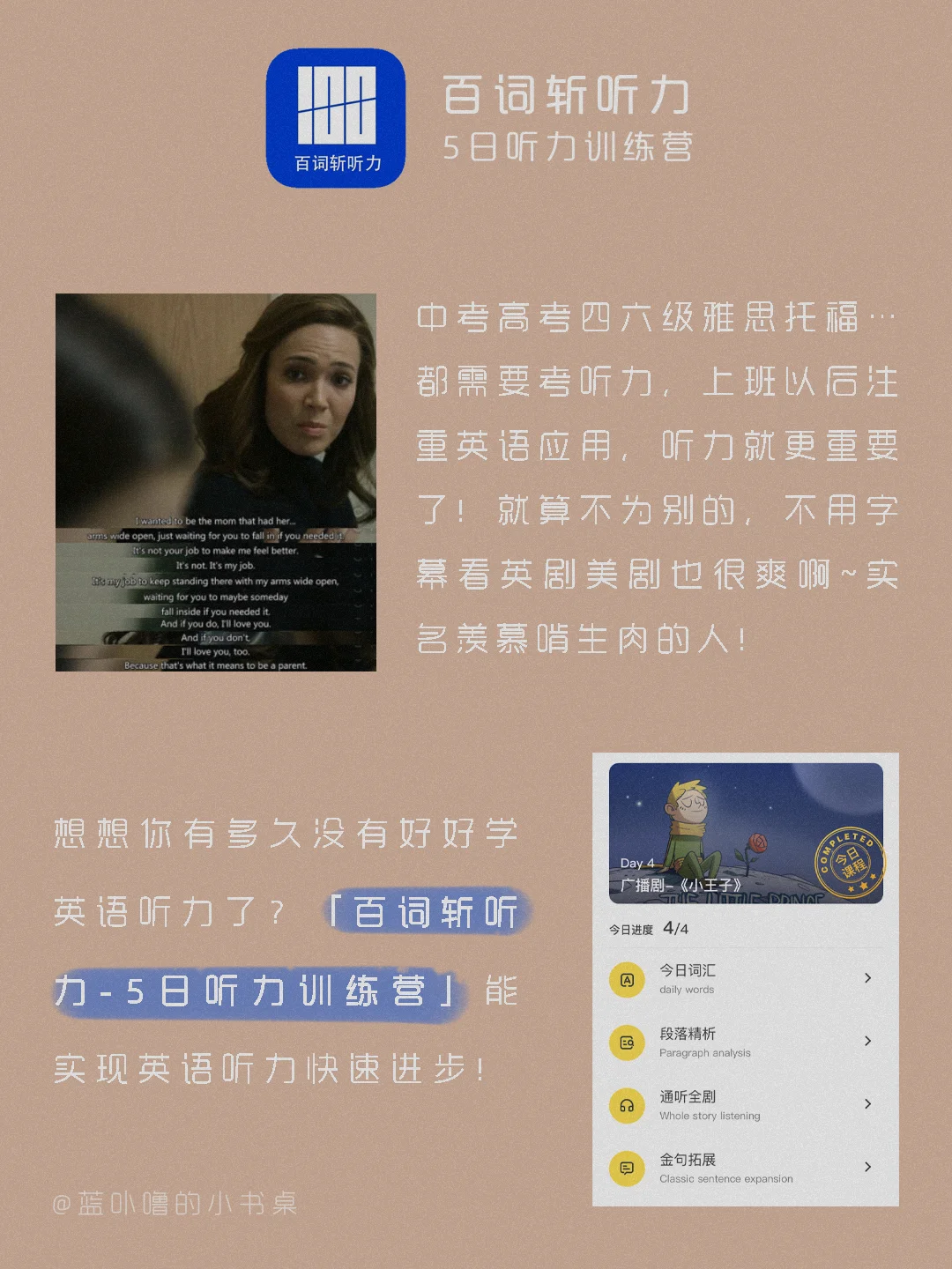 大家好,我是蓝卟噜的小书桌[飞吻R][飞吻R][飞吻R] 我的很多粉丝宝宝是学生党,以前就有宝宝问过我有什么好用的英语听力学习App🤔🤔🤔 最近无意中发现了一个宝藏课程——【百词斩听力-5日听力训练营】🙌🙌🙌🙌🙌🙌 正好现在是寒假,冲鸭🙋🏻♀️ 详细的看👆🏻图就可以辽~ 希望能够帮到你们❤❤ 大家一起做了不起的女孩☺️☺️
