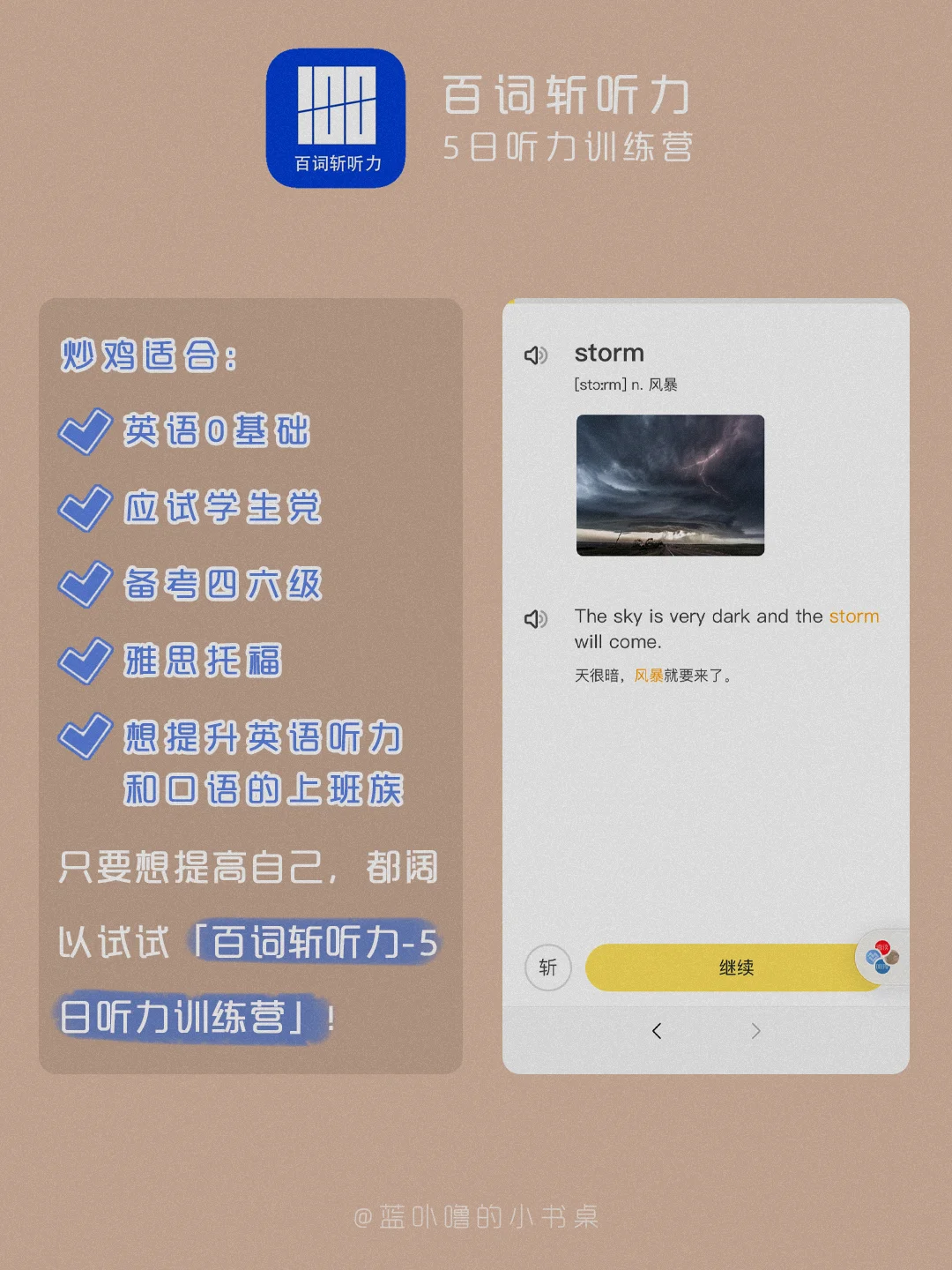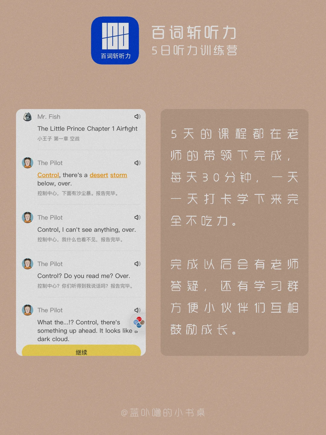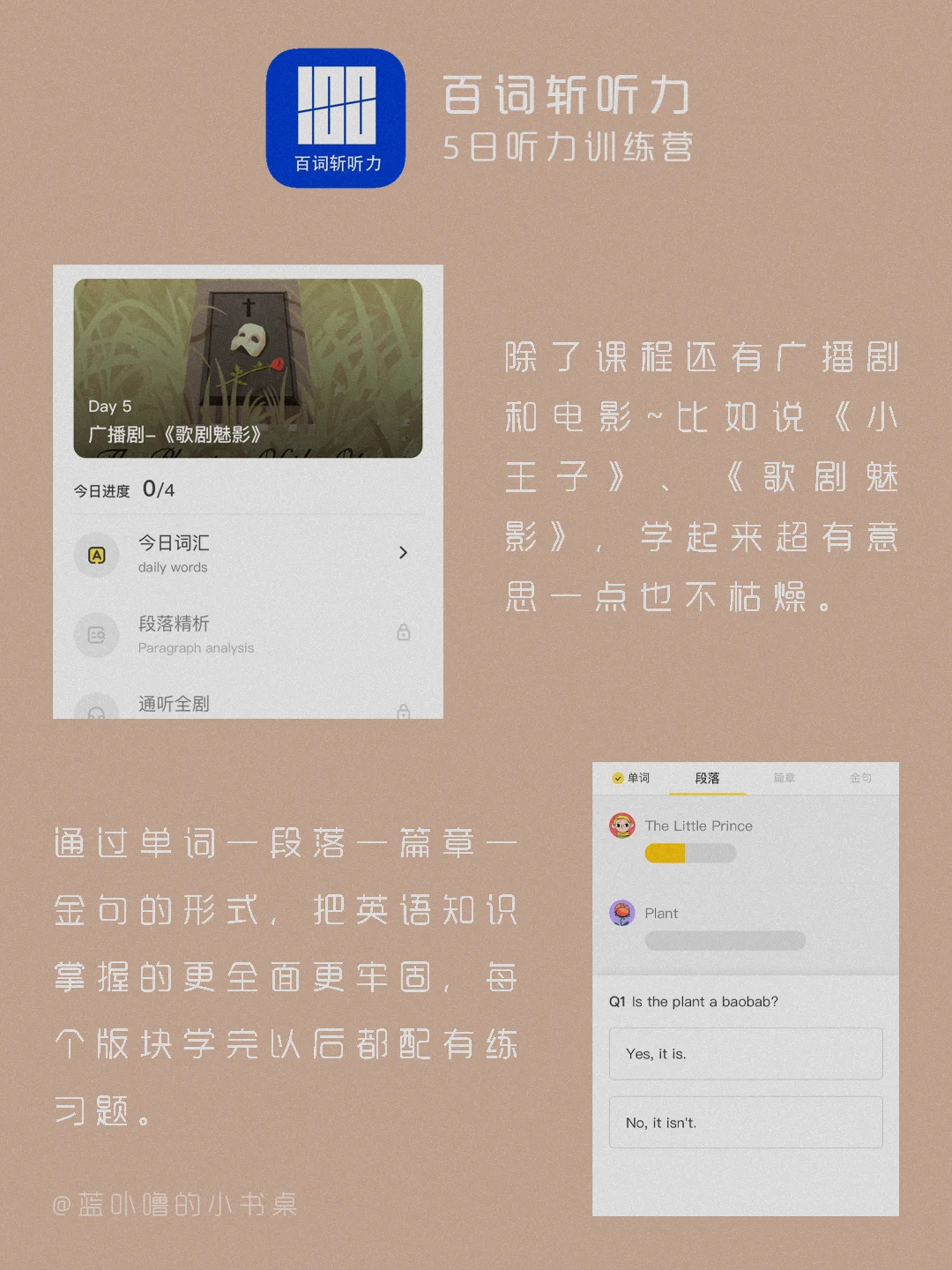 大家好,我是蓝卟噜的小书桌[飞吻R][飞吻R][飞吻R] 我的很多粉丝宝宝是学生党,以前就有宝宝问过我有什么好用的英语听力学习App🤔🤔🤔 最近无意中发现了一个宝藏课程——【百词斩听力-5日听力训练营】🙌🙌🙌🙌🙌🙌 正好现在是寒假,冲鸭🙋🏻♀️ 详细的看👆🏻图就可以辽~ 希望能够帮到你们❤❤ 大家一起做了不起的女孩☺️☺️