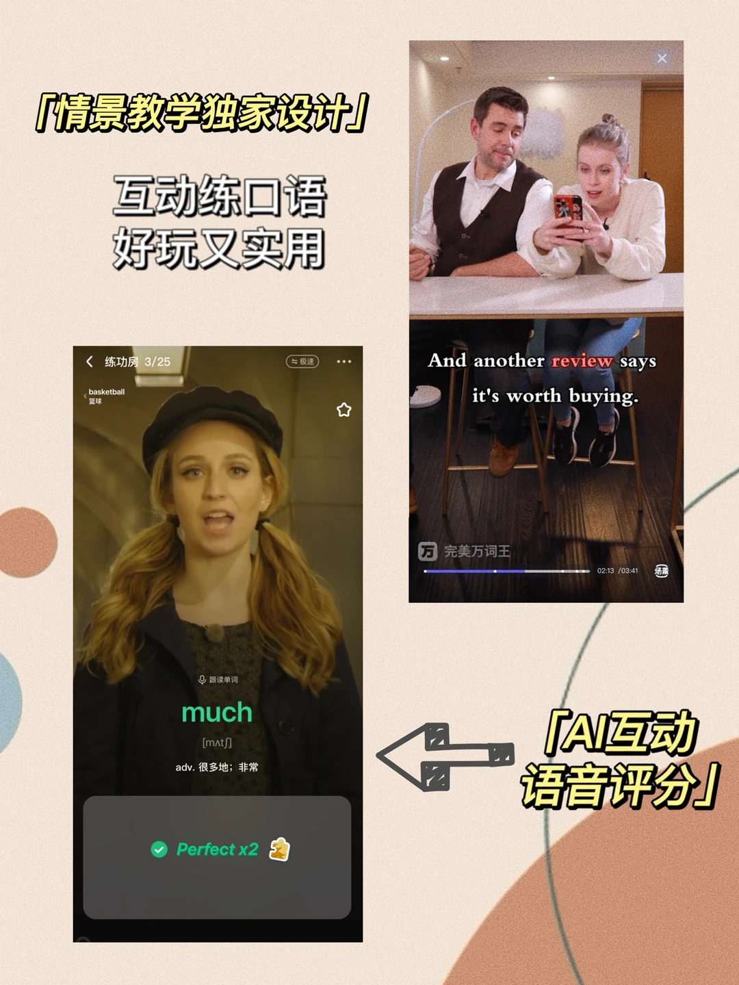 不用怕听不清读音或者发音不标准,学习纯正的英语发音~还有根据剑桥理论独家设计的情景教学搞笑剧、AI语音评分,互动练口语,好玩又实用!