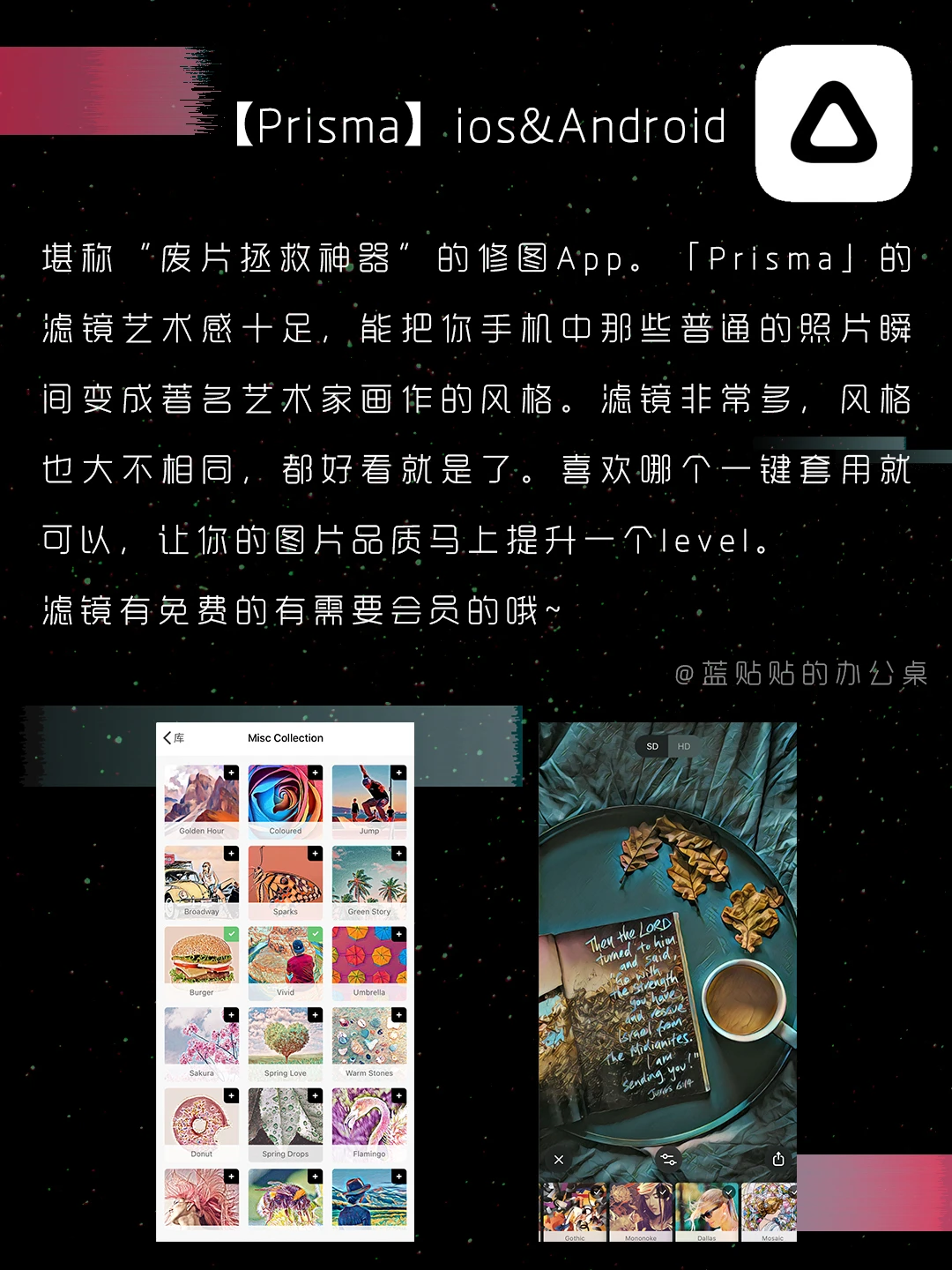 大家好,我是蓝贴贴的办公桌[微笑R][微笑R][微笑R] 这次的App都是很时尚潮流很酷的那种,自带质感✨ 希望大家都能按照自己喜欢的样子生活[飞吻R][飞吻R][飞吻R] 做独一无二的自己💫💫💫💫💫💫💫💫💫 🪐Prisma 🪐当燃 🪐95分 🪐轻聊 🪐MANA 🪐Star Walk2 🪐开眼 评论区,一起分享喜欢❤