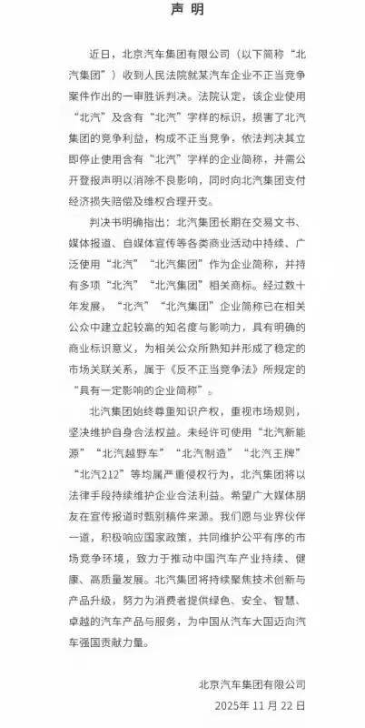 2025年11月22日,北汽集团的一纸声明在汽车行业掀起波澜。声明中提到,法院一