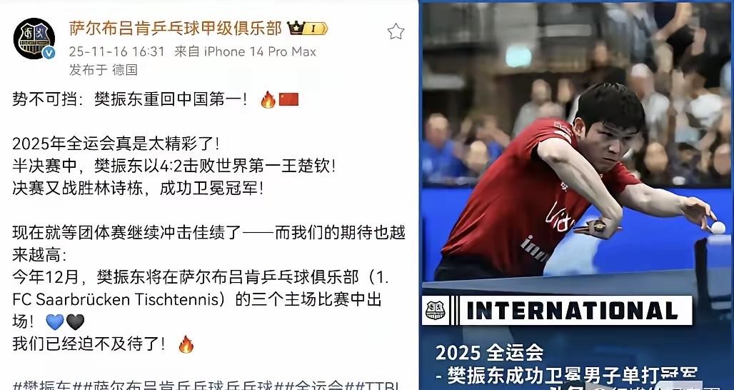 刷屏了!樊振东卫冕全运会男单冠军让整个外媒刷屏了评论区,这份跨越国界的认可,不仅是对他球技的肯定,更藏着体育交流的深层意义。 2025年11月16日,在澳门银河综艺馆举行的全运会男单决赛中,樊振东代表上海队出战,以4比1战胜林诗栋,成功卫冕。 这是他继上届全运会后,再次拿下男单金牌,成为继马龙之后,全运会史上第二位实现男单卫冕的男选手。 更令人震撼的是,整个全运会征程中,樊振东共出场10次,未尝一败,其中在半决赛和团体赛中两次击败世界排名第一的王楚钦,展现出绝对统治力。 决赛第三局起,他调整战术,缩短对拉回合,用精准的前三板压制住林诗栋的攻势,每一次出手都果断干脆,将比赛节奏牢牢掌控在手中。 赛后,央视新闻发文称赞他“拼到最后的坚持,比赛会落幕,但去赢、去超越的征途永不落幕”,这份认可道出了他多年来的坚守。 这场胜利让外媒再次沸腾。法国媒体直言,樊振东的实力早已超越了国际乒联的排名体系,无需排名佐证就是公认的世界第一。 而德国萨尔布吕肯俱乐部的官方表态更为迫切,他们在官文中称樊振东“势不可挡”,并确认他将在12月14日德甲、20日欧冠、21日德甲的三个主场比赛中登场,字里行间满是期待。 德国驻华大使馆也送上祝贺,称他的加盟是“意义非凡的事件”,超越了普通体育转会,成为中德文化交流的纽带。 这一切的背后,是一场酝酿已久的跨国合作。2025年6月1日,萨尔布吕肯俱乐部正式官宣樊振东加盟,这一签约仅用十天便完成。 据了解,是樊振东主动联系了俱乐部,表达了征战欧洲赛场的意愿,且事先已与中国乒协主席刘国梁充分沟通并获得批准。 俱乐部为他提供的基础年薪高达120万欧元,约合人民币980万元,远超国内乒超顶级选手50-80万元的年薪水平,收入涨幅超10倍。 这样的薪资待遇,源于他在国际乒坛的绝对地位。德国名将波尔直言,樊振东是自己心目中的历史最佳,征战多年从未赢过他。 日本选手张本智和则将他比作“无法翻越的高山”,坦言即便全力以赴,也难以撼动这位中国选手的统治地位。 瑞典名将莫雷加德更是将击败樊振东定为职业生涯的终极目标,输球后还会主动向他请教技术问题,足见其在对手心中的分量。 樊振东的留洋,并非一时兴起。此前WTT的新规让世界排名前十的选手退赛面临高额罚款,密集的赛事也让他难以调整状态。 而德甲每周2-3场的比赛节奏,既能让他保持竞技状态,又能有足够时间打磨技术,这种差异化的赛事环境,成为他选择留洋的重要原因。 有趣的是,萨尔布吕肯俱乐部与中国乒乓有着深厚渊源,不仅主教练是王志,此前还曾签下樊振东的上海队队友尚坤,上赛季林高远也代表德甲球队征战过欧冠。 这并非个例,2025年10月19日,中德青少年乒乓球友谊赛在安徽黄山开打,德国下萨克森州乒协代表团与中国小将们以球会友,续写着两国体育交流的佳话。 樊振东的加盟,无疑让这种交流上升到新的高度,小小的银球成为连接中德两国的桥梁,让体育外交有了更生动的注脚。 网友对此也议论纷纷。有人为他的留洋点赞,认为这是中国体育走向世界的体现,能让更多人了解中国乒乓的实力;也有人担忧,密集的国内外赛事会影响他的状态,进而影响国家队的表现。 中国乒协的态度则十分明确,尊重运动员的个人意愿,并表示会全力支持和保障他保持良好竞技水平,为乒乓球事业再创辉煌。 在我看来,樊振东的成功卫冕和跨国加盟,是实力与格局的双重体现。他用十战全胜的战绩证明,即便暂时退出世界排名,实力也不会褪色。 而选择留洋,不仅是为了个人职业生涯的突破,更是以个人影响力推动中外体育交流,这种“走出去”的勇气,值得更多运动员学习。 展望未来,12月的德甲赛场将迎来中国乒乓的身影,樊振东有望在欧洲赛场继续书写传奇。随着他的加盟,萨尔布吕肯俱乐部的欧冠夺冠概率大幅提升,德甲的关注度也将迎来新的高峰。 对于国家队而言,留洋经历能让他接触到不同的战术风格,积累更多国际赛事经验,这反过来也会促进中国乒乓的发展,形成良性循环。 体育的魅力,不仅在于竞技场上的胜负,更在于它能跨越国界、连接人心。樊振东用自己的行动,诠释了何为体育精神,何为大国运动员的担当。 相信在未来,会有更多中国运动员走出国门,在国际赛场上展现中国力量,让体育成为中外交流的重要纽带。 文章描述过程、图片都来源于网络,涉及版权或者人物侵权问题,或有事件存疑部分,联系后即刻删除或作出更改