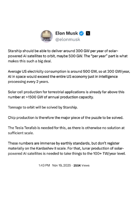 在美国沙特投资论坛之后的第二天,马斯克再次强调,这些AI卫星每年能产生100吉瓦的太阳能——相当于美国年平均用电量的四分之一。“我们已经把计划完全排出来了,会非常疯狂。”
