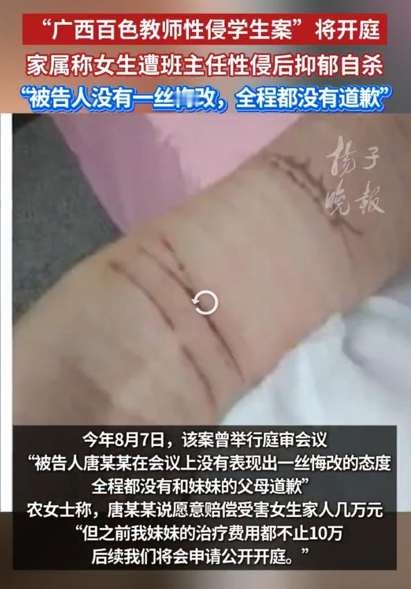 女生遭班主任性侵后抑郁自杀,这是发生在广西百色的教师性侵学生案,根据扬子晚报报道,该案被告人唐某某涉嫌强奸罪、强制猥亵罪将于11月30日不公开审理,而受害者家属表示,将申请公开审理。 从旁观者的角度来看,我支持家属申请公开审理。因为,女学生都已经死了,人都没有了,现在要的就是给女孩一个公开的交代,事情已然发生,事已至此,没有必要不公开审理。当然,从法院的角度来说,可能死者是未成年人,所以才不公开审理,这也是可以理解的。 只是,家属后续将申请公开审理,一方面是要严惩女孩的班主任,因为在“2017-2020年间,对未满16岁的符某某长期进行性侵”,这种老师简直就是披着人皮的狼,一个正值花季一样的女孩被这种不配为人师表的人给毁掉了,令人唏嘘不已。 另一方面,刑事附带民事诉讼方面,在之前的庭审会议中,犯罪嫌疑人不但没有悔意,没有道歉,而且只愿意赔偿几万块钱,这几万块钱能干吗?按照家属的说法,女孩治病都花了不止10万。现在嫌疑人知道自己上有老下有小了,教师的脸都被这种人给丢尽了,做了伤天害理的事情,必须要受到法律的严惩和道德的谴责。