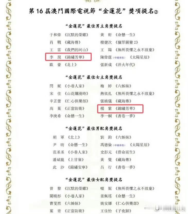 一大清早好事发生 杨紫和李现这下该开心了 朋友还是老的好一点也没有说错,杨紫和李现提名金莲花最佳男女主角,而且《国色芳华》获得6项提名,就是全方位降维打击。 杨紫目前还没有进组,李现《长风起》也杀青了,两个人目前都有档期,金莲花颁奖典礼他们很有可能同台呀,时代。