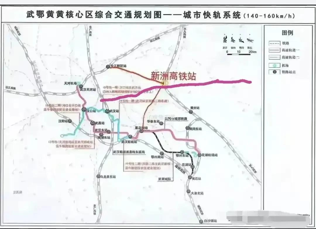 重磅消息!京九高铁新洲东站选址尘埃落定!黄冈埠黄高铁线路图出炉!新洲东站高铁项目土地平整工作正在进行时! 京九高铁新洲东站落户辛冲的戢岗村。在新洲大学城、新洲邾城客运站附近几百米。京九高铁新洲东站规划图中首期2台6线,预留武杭高铁接入条件,未来8台16线。届时新洲东站坐高铁可直达北京、香港、杭州、上海、重庆,新洲大学城发展前途无量。 此前消息,新洲东站是武汉市多层级综合客运枢纽体系中的对外客运枢纽之一,隶属于“二级枢纽”层级(与武汉站、武昌站、汉口站直通直连)。2025年4月25日,武汉市人民政府在《武汉市国土空间总体规划(2021—2035年)》中明确其定位,规划位于问津大道正东延长线戢岗村至罗坪河村之间。 新洲东站是规划中京九高铁阜阳至黄冈段(又称京九高铁西段)的组成部分,该线路串联大别山革命老区与武汉都市圈,是武汉对接粤港澳大湾区的重要通道。其功能定位为武汉铁路枢纽格局中的辅助客运枢纽站之一,旨在弥补新洲区无高铁站的短板。新洲区高铁设站是红色老区融入武汉都市圈、承接产业转移的关键机遇。这是京九高铁在武汉都市圈的唯一站点 。 目前,新洲区是武汉唯一既无地铁也无高铁站的区,发展受限明显。新洲东站建成后,将打通武汉北上山东半岛、南下粤港澳大湾区的新通道,同时助力武鄂黄黄城市群协同发展。有专家建议,新洲东站应同步规划综合交通枢纽,联通地铁邾城线,与武汉枢纽直通线、与京九铁路新洲火车站、与阳逻国际港联动,打造“铁水联运”物流节点。 信息综合自网络