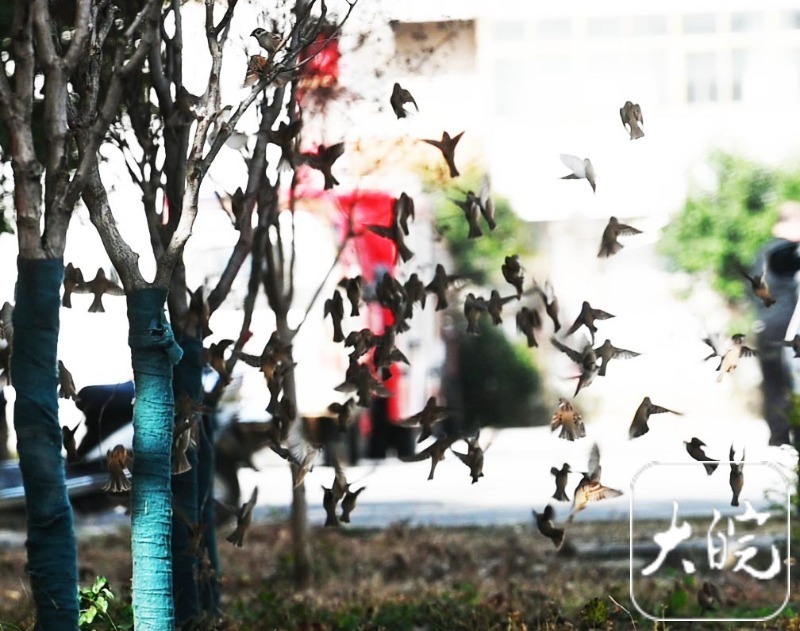 大皖新闻记者看到,镇政府大院里鸟声不绝。有几棵枝叶茂盛的玉兰树,粗大的树冠里,成百上千只鸟儿在绿叶间栖息,这里俨然鸟的乐园;绿化带里有一些小树,虽然叶子落完了,但仍有许多小鸟在树枝上栖息,远远望去,仿佛树枝上“长出鸟形的叶子”;偶尔有人经过,绿化带里立刻飞起一群鸟。