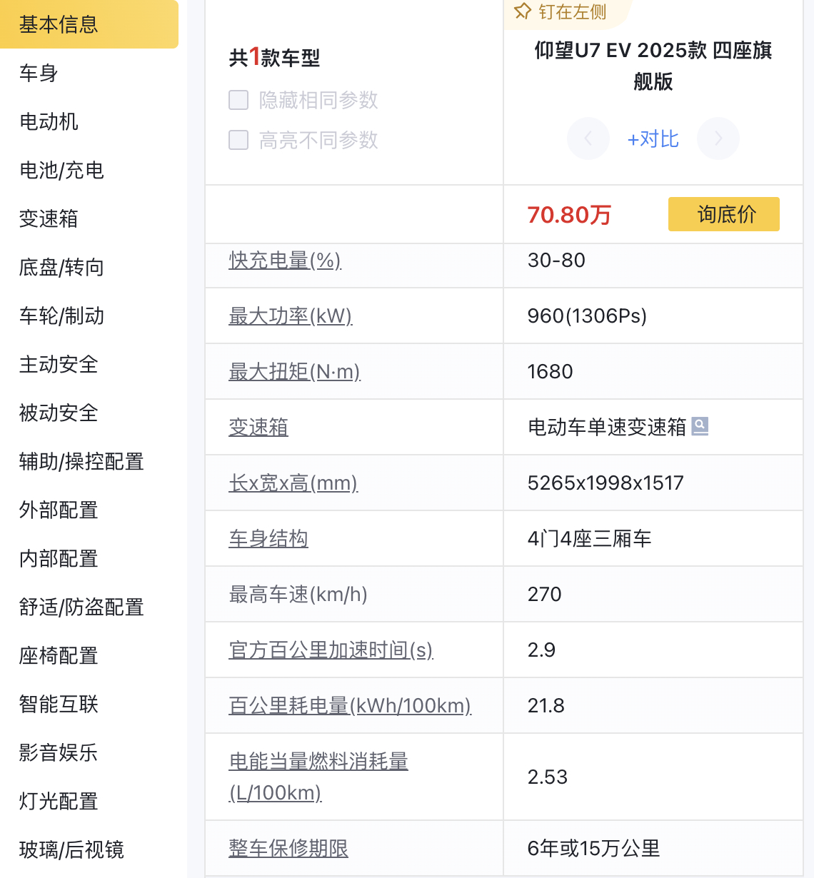 仰望 U7 这车到底是做出来卖给谁的啊?之前我一直觉得仰望 U8 很多设计画蛇添足,U7 外观看起来感觉还可以了,但一看内饰就有点像早期国外超豪的样子,但只是样子像,质感又感觉没那么高档,总之这套设计我是真欣赏不来。然后一看配置又非常高,感觉是比亚迪的好东西都塞进去了。但好像也不是追求极速的,加速刹车性能便宜一半的车可能都有了,车重也非常重显然也不适合跑山。那么这个车定位到底是啥?