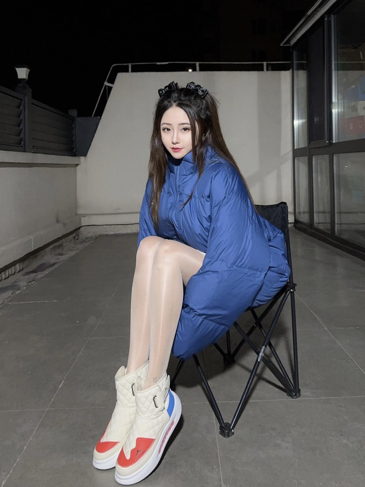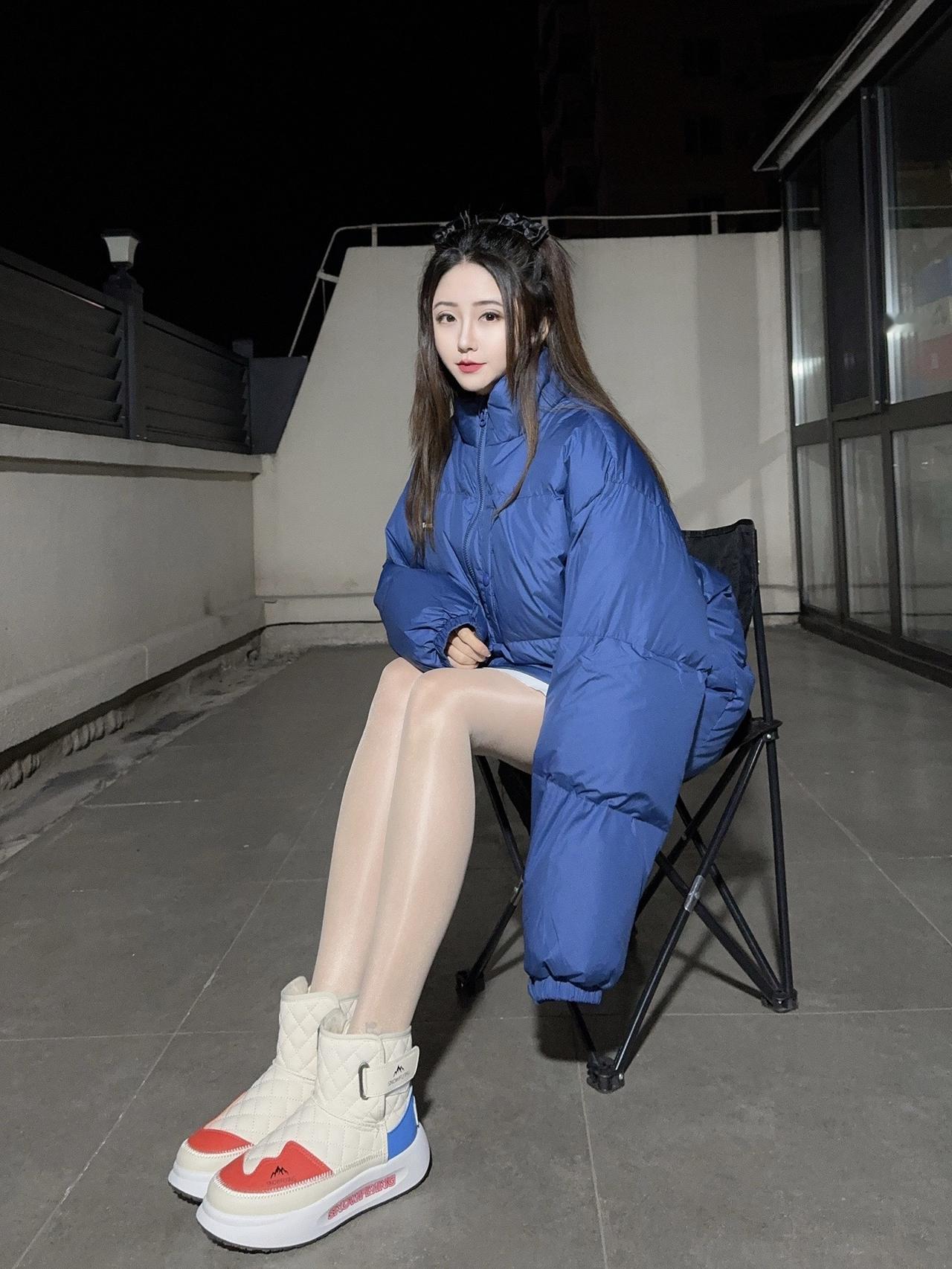冬日生活打卡季冬日雪景下的时尚穿搭,白色羽绒服搭配蓝色牛仔裤和高跟鞋,尽显优雅