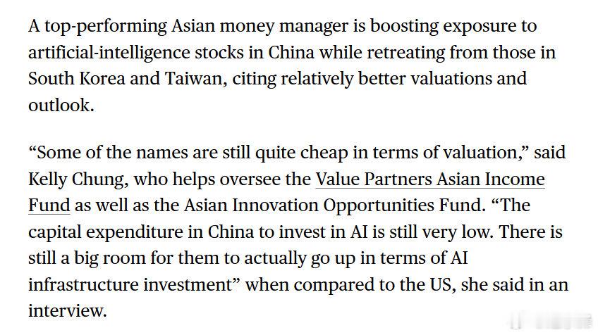 彭博:过去一年跑赢至少98%同类基金的惠理基金正在增持中国大陆AI相关股票,同时减持韩国和台湾的标的,理由是前者估值和前景相对优势。中国AI基础设施仍有很大增长空间。自今年8月以来,惠理CIO钟慧欣一直减持后者,转而增持在香港上市的中国超大规模数据中心运营商,并预计这种轮动趋势还将继续。