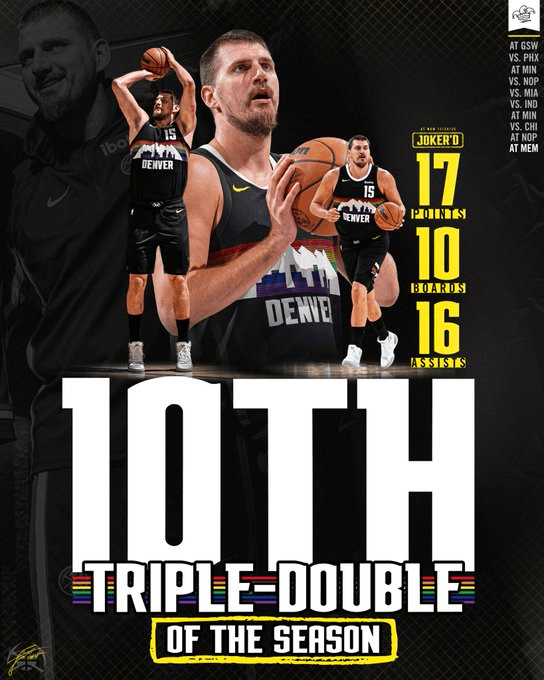 赛后,掘金官方晒出约基奇的海报:“约基奇三双已上双!”