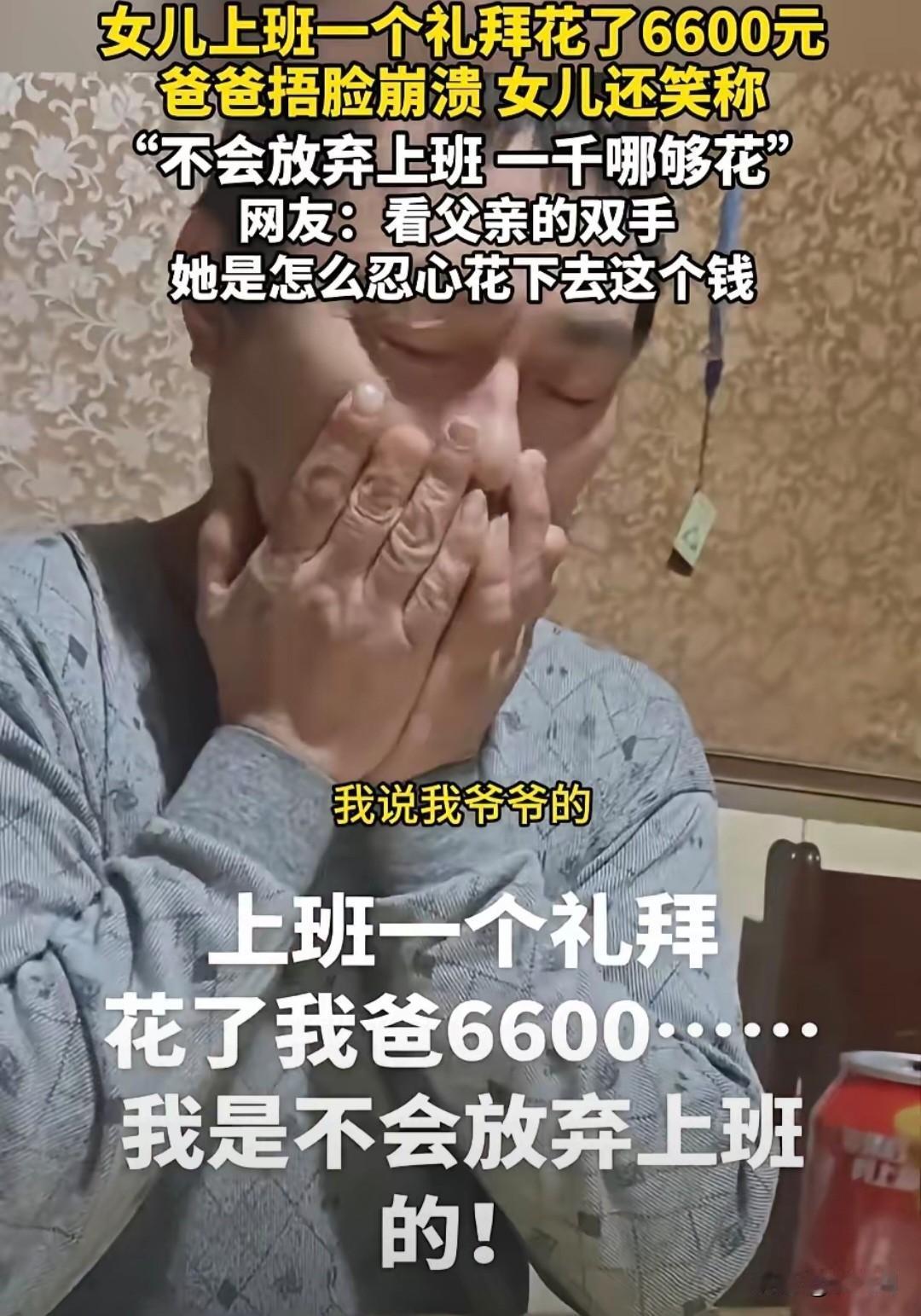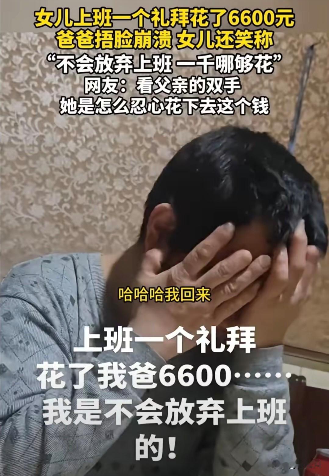 家里出了一个败家子!一女子入职一周赚了1000块,但却花了父亲6600块! 一女子在网上炫耀自己离职了,入职一周就离了职,挣了1000块钱,但却花了父亲6600块。 周一新入职,她花1200元买了一套职场穿搭,为了有面子,第一天上班不能太寒酸。 上班第二天,她发现公司食堂的饭菜难以下咽,再加上新入职,她觉得有必要请大家吃个饭,于是她就在这天中午请同事们吃了一顿午餐,花了800元。 当天晚上,她又约了几个朋友去网红餐厅打卡,花了650元。 周三这天她觉得上班有点累了,尤其是挤地铁太难受,索性就打车上下班,花了120元,当天下午她还点了奶茶,一共四杯(和同事分享),花了68元, 周四这天,她下班去逛了商场,买了新化妆品,花了1500元。 周五这天终于熬到了下班,为了庆祝自己入职,下班和朋友去KTV放松,花了580元,晚上她和朋友去吃了烧烤,花了230元。 周末她又去消费,美甲美睫花750元,又买了两双好看的鞋子花了1000元。 她入职一周,前前后后花了6600块,这都是父亲的钱,而她每个月的工资才4000块。 所以她觉得这份工作根本养活不了自己,索性就离职了,这一周她挣了1000元,花了6600元。 她为了引发共鸣就拍了视频发在网上,吐槽“上班根本养不活自己,赚的钱还不够一周花的”。 她在视频里嘻嘻哈哈,问父亲:“你知道我是以什么理由离职的吗?哈哈,我说我爷爷得了脑梗!”真让人无语,怎么不找个其他理由,非得这样诅咒家人吗? 她老实巴交的父亲在一旁掩面哭泣,从穿着打扮来看,这位父亲应该不是大富大贵,衣着朴素甚至有点寒酸。仔细观察他擦拭眼泪的手,愕然发现手指残缺不全,像是出过事故。 这位父亲为了供养女儿已尽心尽力,6600块对于他来说可能是一两个月的工资,但在女儿看来却轻如鸿毛,短短几日就挥霍一空。 这位父亲掩面哭泣,可能是因为女儿的不懂事,而他却无能为力,劝也劝不动,舍也舍不下,除了哭泣别无他法。 富贵人家爱出浪荡子,没想到普通人家也出了这么一个败家子。 她这样的高消费,得需要找一个月薪三万以上的工作,但现在想找一份这样的工作应该是相当困难的。 很多网友认为她这样上班,还不如待在家里,起码不会花父母那么多钱。但这位女子在视频里表示自己是不会放弃上班的。 人家还挺有志气,不过这可苦了她父亲了!再入职一次,同样流程走下来,又不知道花多少钱! 现在的年轻人,真是离谱,挣不了多少钱,花钱大手大脚,真把自己当富二代了,但你没想想家里啥情况? 父母供你读书,毕业后一切就得靠自己不要求你“乌鸦反哺”,起码得做到自力更生。父母辛辛苦苦攒了点钱,没因为你上学掏空家底,反倒等你上班了还得倒贴你,关键年轻人还觉得理所应该!真是悲哀! 你家里有刚上班的孩子吗?他们可以养活自己吗?需要你补贴吗? 上班 消费 超7成年轻人存款不足10万
