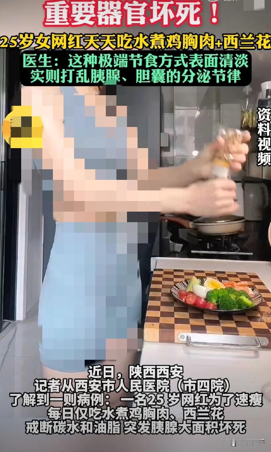 西安市人民医院(市四院)了解到一则病例: 一名25岁网红为了速瘦,每日仅吃水煮鸡胸肉、西兰花,戒断碳水和油脂,突发胰腺大面积坏死。 这种做法太极端,当“自律”演变为自我摧残时,健康便成了审美焦虑的牺牲品。 减肥就是保留一定热量缺口,千万不要长时间极端饮食。网上那些“网红食谱”,好多都是为了流量博眼球,要注意分辨。每个人的身体都不一样,凡是承诺“一周瘦10斤”、“一个月暴瘦”的方法,背后都隐藏着巨大的健康风险。 追求美是人的天性,追求好身材没错,但前提好好吃饭,均衡营养,搭配运动,比啥都强。别再被那些极端的“自律”给骗了。健康,永远是美的底线和前提。