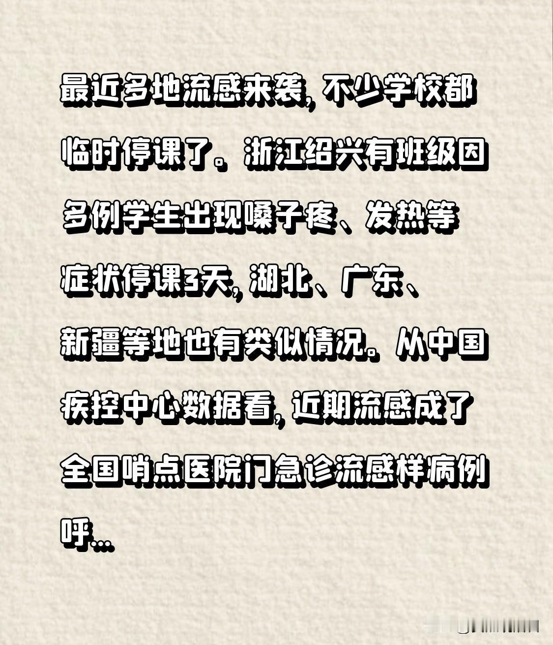 最近多地流感来袭,不少学校都临时停课了。浙江绍兴有班级因多例学生出现嗓子疼、发热等症状停课3天,湖北、广东、新疆等地也有类似情况。 从中国疾控中心数据看,近期流感成了全国哨点医院门急诊流感样病例呼吸道样本检测阳性率第一的病原体,占比17.5%,5 - 14岁病例较多,学校聚集性疫情报告显著增多。 按照《流感样病例暴发疫情处置指南(2018年版)》,班级当天新发现流感样病例达5例及以上等情况,经评估可能进一步扩散,就可能停课4天。希望大家都做好防护,少受流感侵扰。 病毒流感 预防新型流感 冬季流感