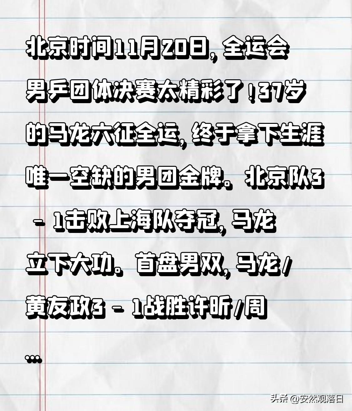 北京时间11月20日,全运会男乒团体决赛太精彩了!37岁的马龙六征全运,终于拿下生涯唯一空缺的男团金牌。北京队3 - 1击败上海队夺冠,马龙立下大功。 首盘男双,马龙/黄友政3 - 1战胜许昕/周恺,为北京队抢得先机。从资格赛就开始磨合的他们默契十足,而上海双打的起伏成了隐患。第二盘樊振东虽3 - 1逆转王楚钦,但也无力回天。马龙顶住压力,补齐了职业生涯的最后一块拼图,这枚金牌对他而言意义非凡,实至名归! 全运会乒乓球赛
