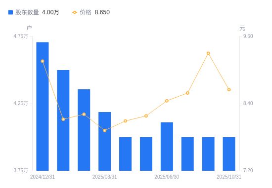 日期A股户数(户)流通A股户均持股数(股)户均持股市值(万元)2025-10-314000010360.998.962025-08-314000010360.999.642025-07-314000010360.998.902025-06-304109910083.938.522025-05-314000010360.998.482025-04-304000010360.998.382025-03-31418799896.127.842025-02-28435659513.137.812025-01-31450009209.777.482024-12-31470738804.198.06