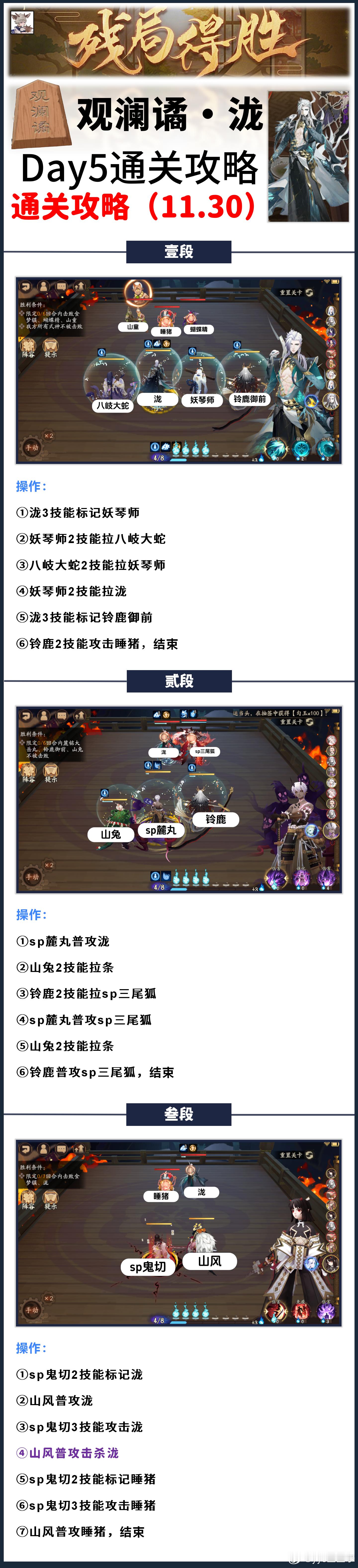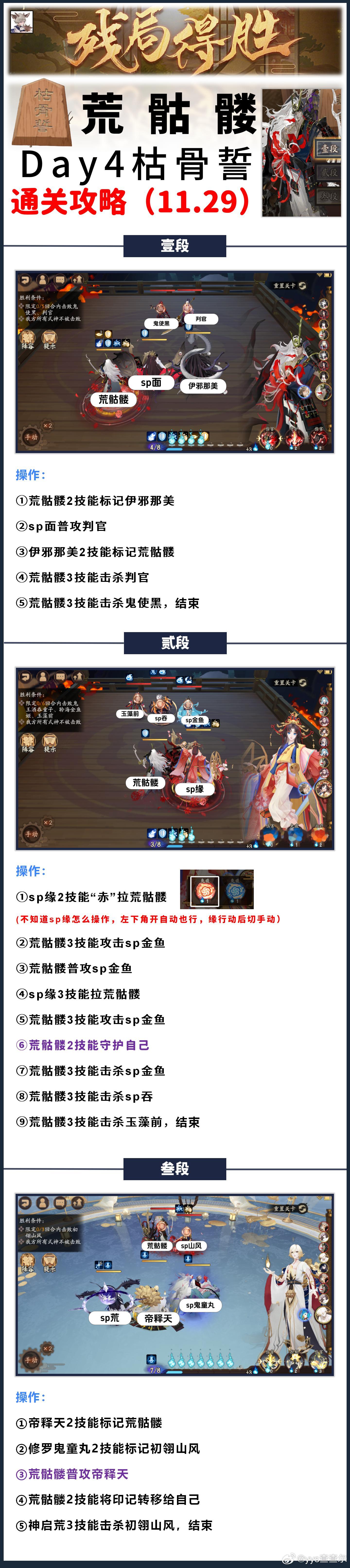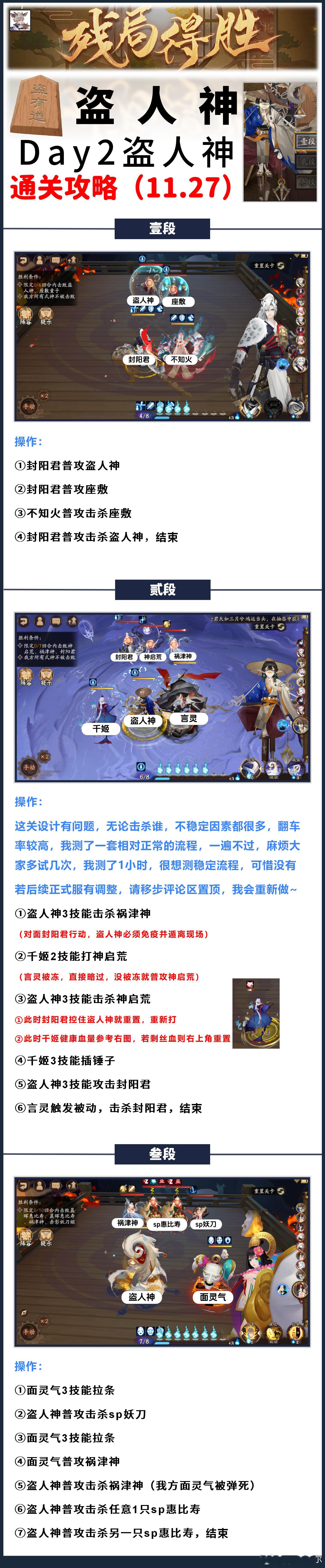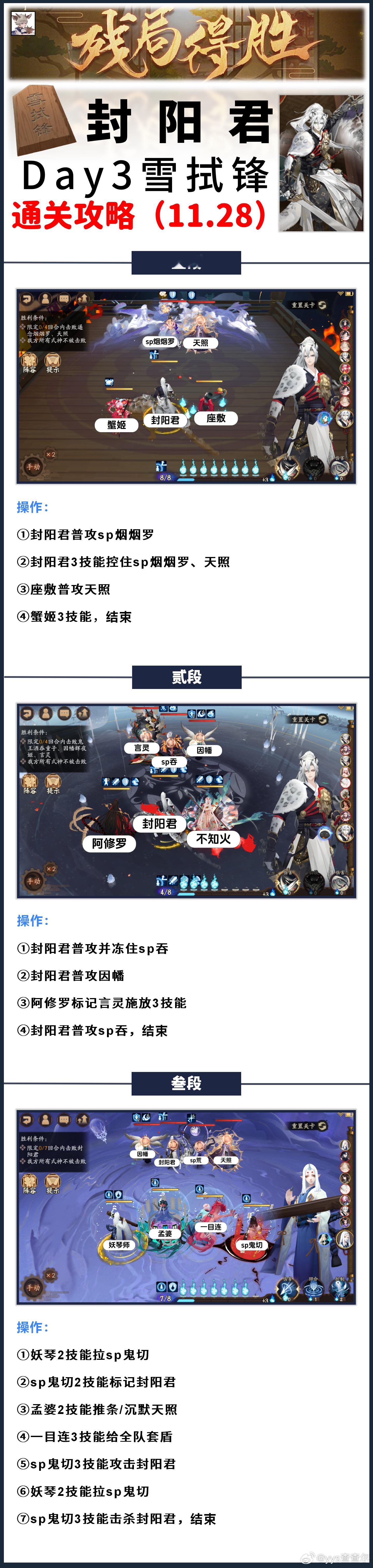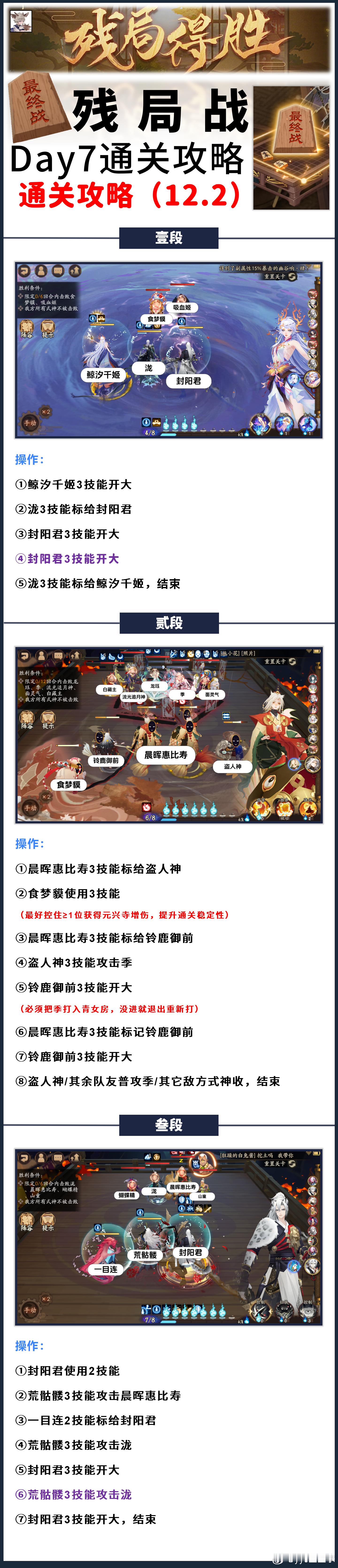 【残局得胜】25年11月版合集,省心速通,保姆级流程!■某些关卡在设计上存在不稳定因素,稍有不慎就会翻车(day2的第二关,day6的第三关,这两关不稳定因素很多,容易翻车,如果正式服调整了关卡难度,我会及时在评论区告知大家并对原文进行替换)■在本系列攻略中,大家尽可放心的抄作业,已全程规避需要赌运气的点,尽量保证大家一遍就能过~■因对面随机控制/攻击导致的翻车没办法避免(已在图文中标注了这些翻车点)※攻略基于体服制作,若正式服对某些参数进行了调整,会第一时间在评论区告知大家