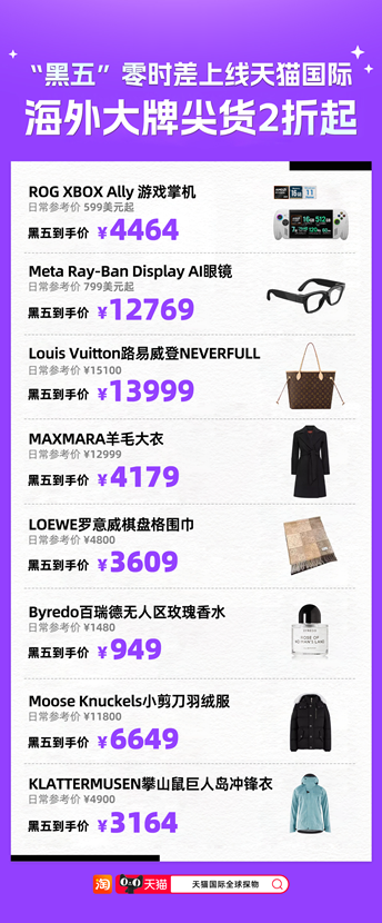 据了解,有2万多个海外品牌,800多万款进口商品和海外“黑五”同步零时差上线天猫国际,大牌尖货低至2折起。