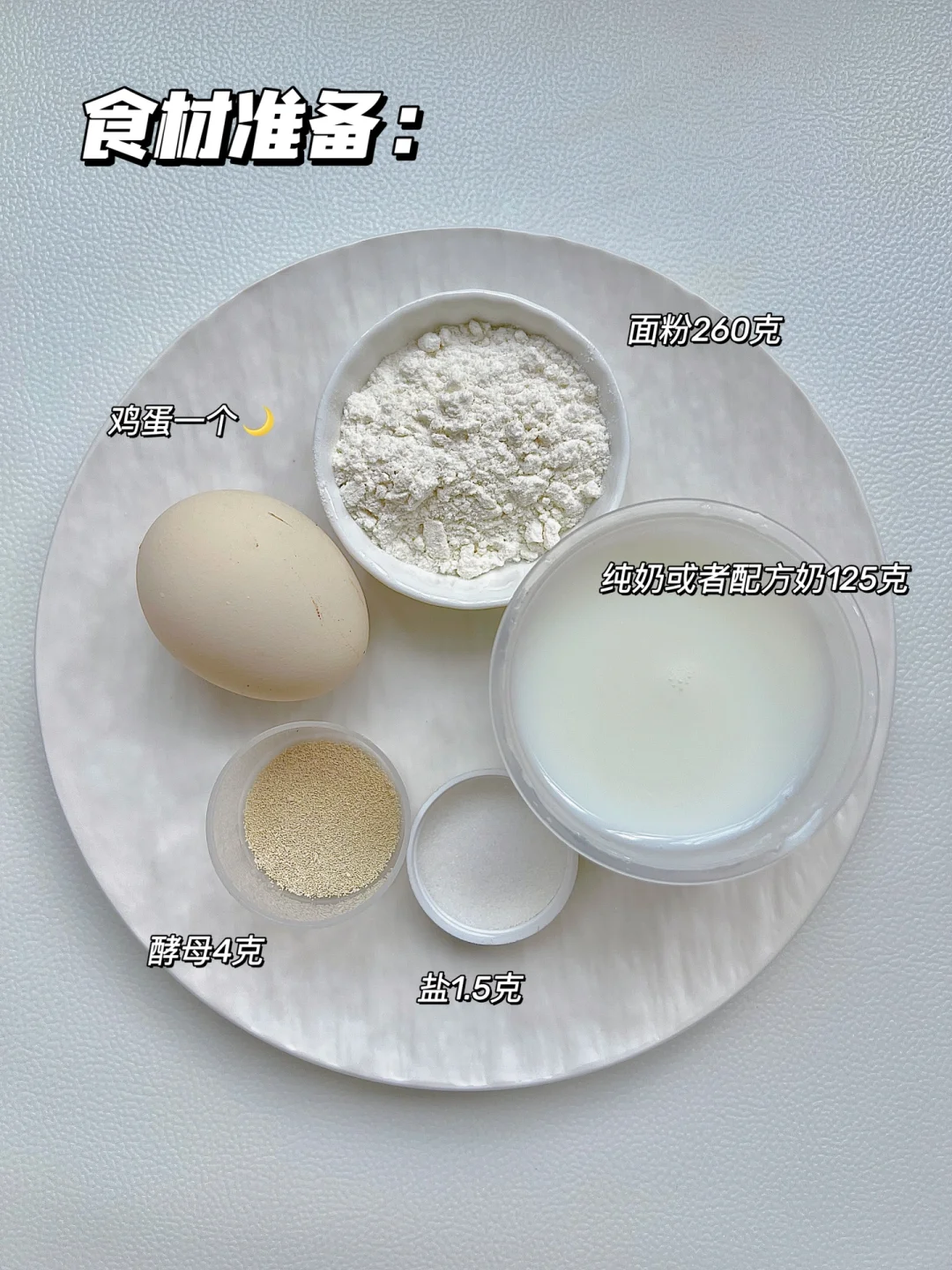 面粉260克,纯奶或者配方奶125克,鸡蛋一个,酵母4克,盐1.5克