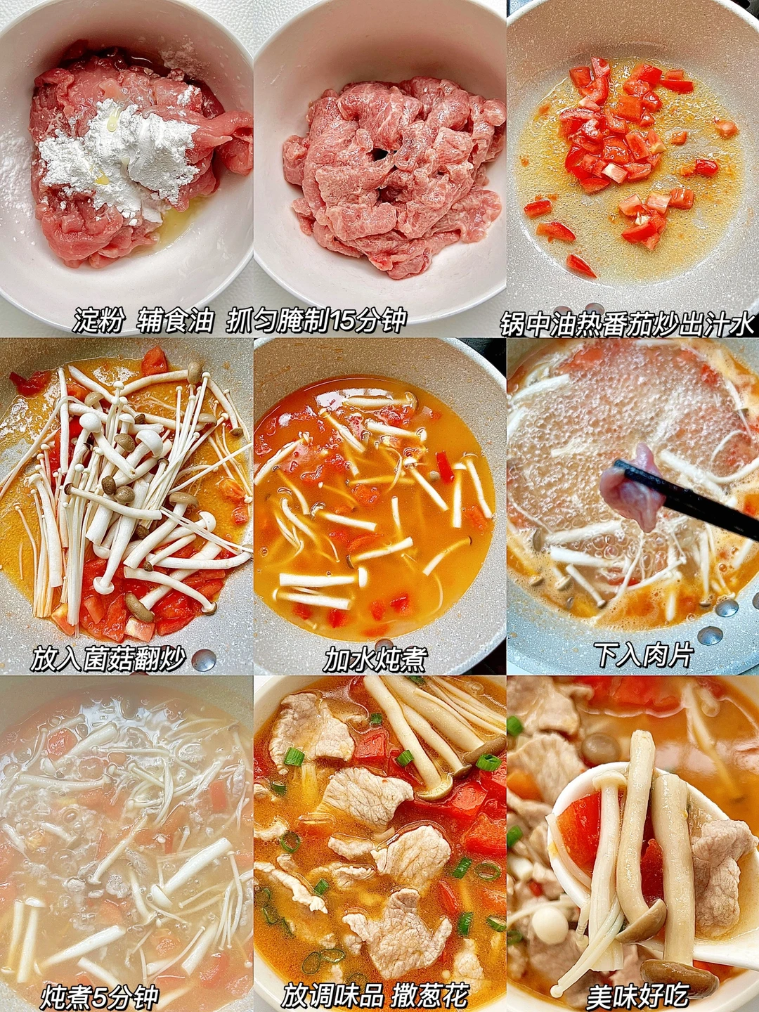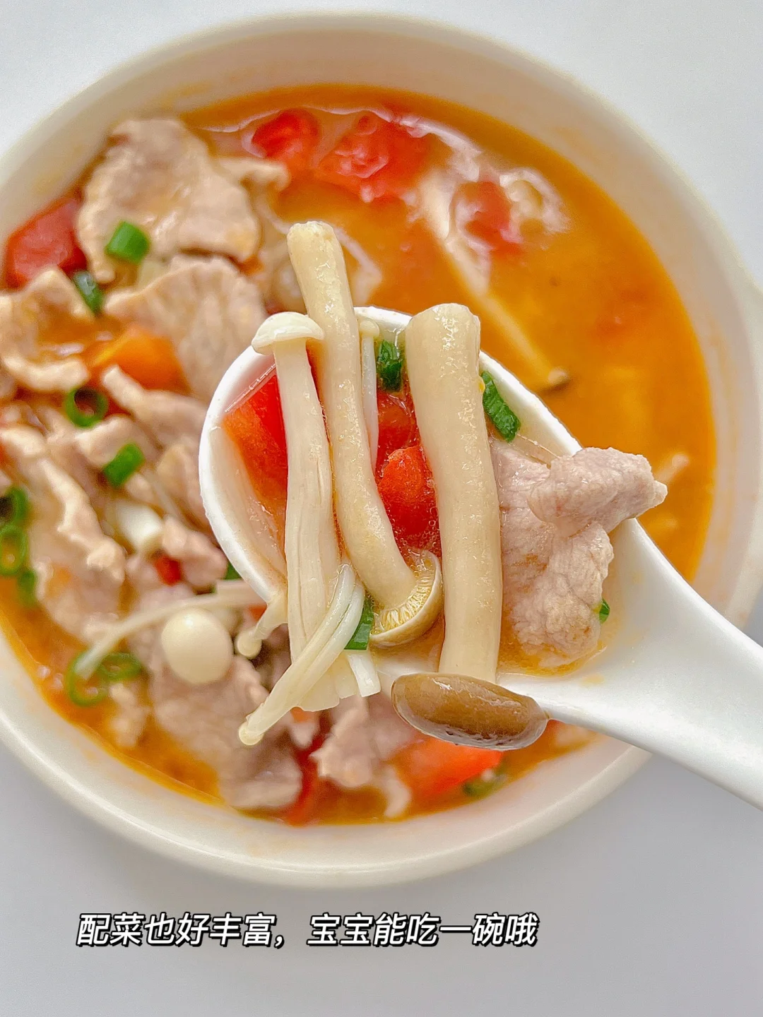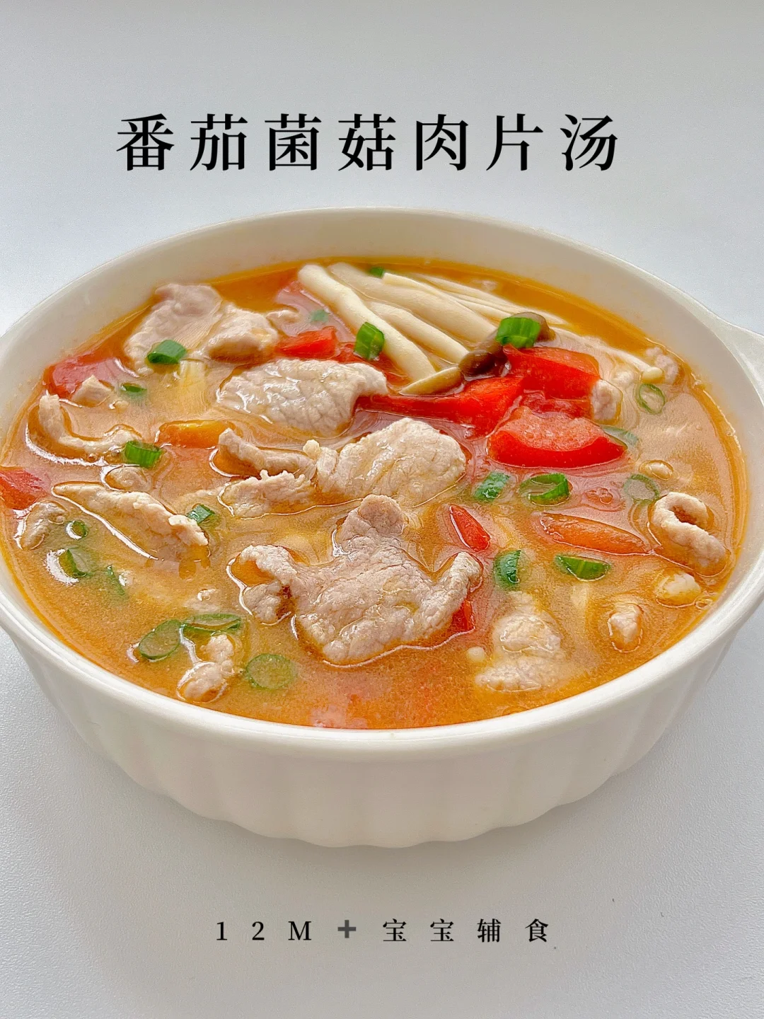 🥣番茄搭配菌菇,肉片鲜嫩好吃,汤鲜味美,我家宝宝每次都吃一大碗,喝的汤都不剩哦~😊