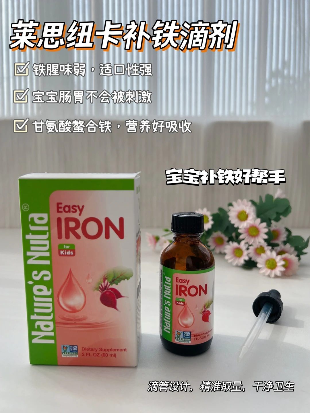这款补铁剂是甘氨酸螯合铁,小分子结构,不会刺激宝宝的肠胃,含铁量也很高呢,每1ml富含5mg!不用添加维生素C,也能很好吸收上,成分表也非常简单,X香精、X色素、X蔗糖,可以直接吃,也可以滴在奶里、水里、辅食里,口感酸酸甜甜的,宝宝第一次喝就接受了!棕色玻璃瓶身可以避光,液体不易氧化,而且还是滴管设计,自带的滴管刻度清晰,取量很方便,每天给宝宝奶里滴一毫升就足够,还有收纳管,千净又卫生呢!