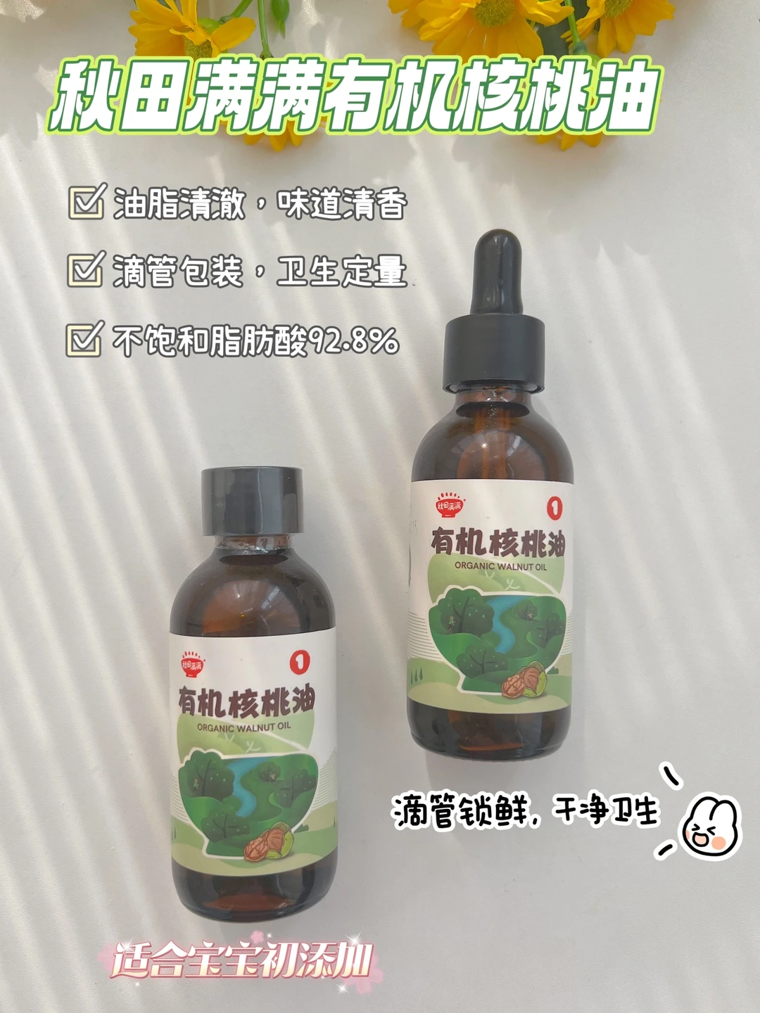 🧚🏻♀️平时给宝宝做辅食,我喜欢滴几滴秋田满满有机核桃油,不饱和脂肪酸含量92.8%,有机核桃冷榨工艺,能满足宝宝日常所需;滴管设计,精准控量,更加卫生;配料表干净味道清淡不苦涩,宝宝很爱吃,增加了辅食的香味,容量小不易浪费~