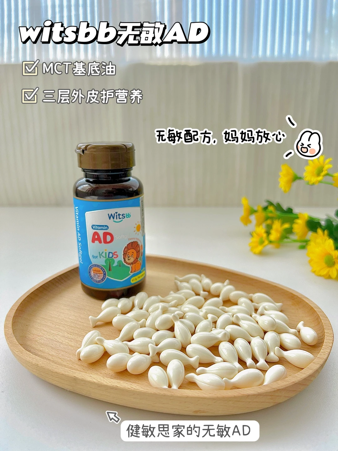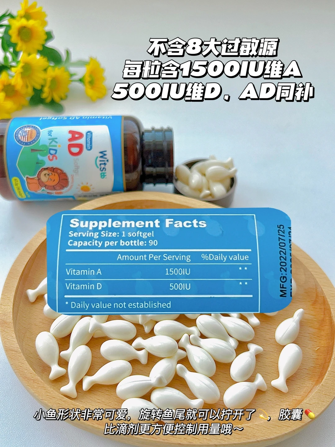 后来我给宝宝换了健敏思家的无敏AD,这款不含牛奶蛋白、海鲜、麸质等8大常见过敏原,用的是MCT油,每粒含1500IU维生素A和500IU维生素D,AD同补更方便科学~