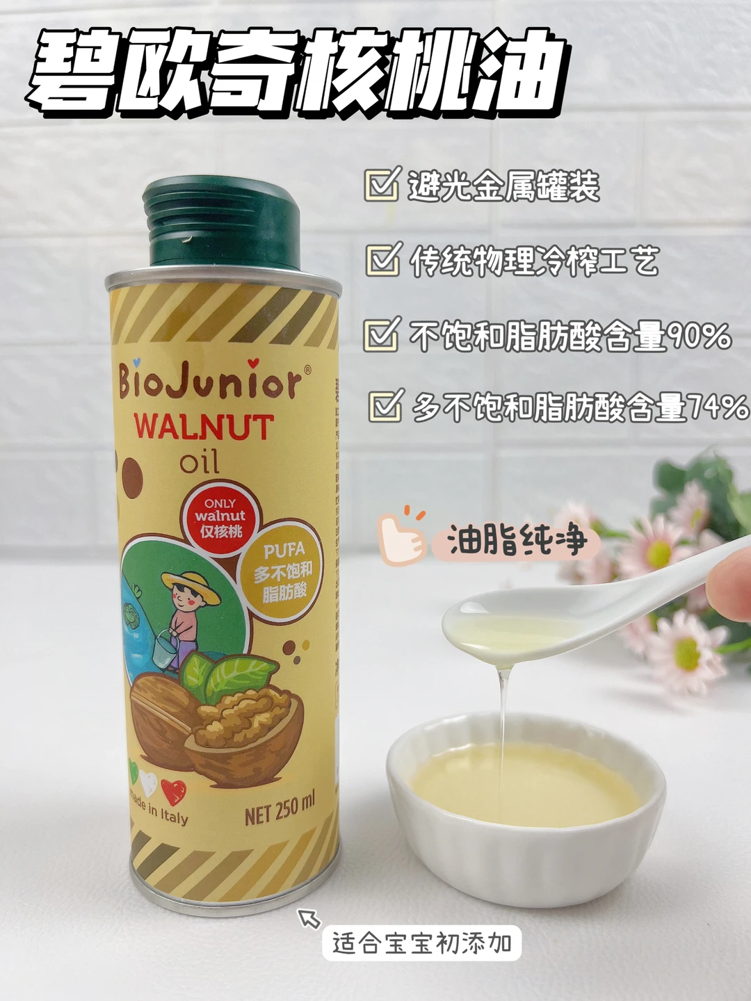 🧚🏻♀️今天做山药球,我特意滴了几滴碧欧奇核桃油,它采用的是金属避光罐装,能更好的避光锁鲜,避免营养成分omega3、6发生光氧化,产生有害物质。多不饱和脂肪酸含量74%,不饱和脂肪酸高达90%。能更好的为宝宝补充必须脂肪酸,而且采用的是物理低温冷榨技术,油脂纯净,宝妈们可以放心选择哦~
