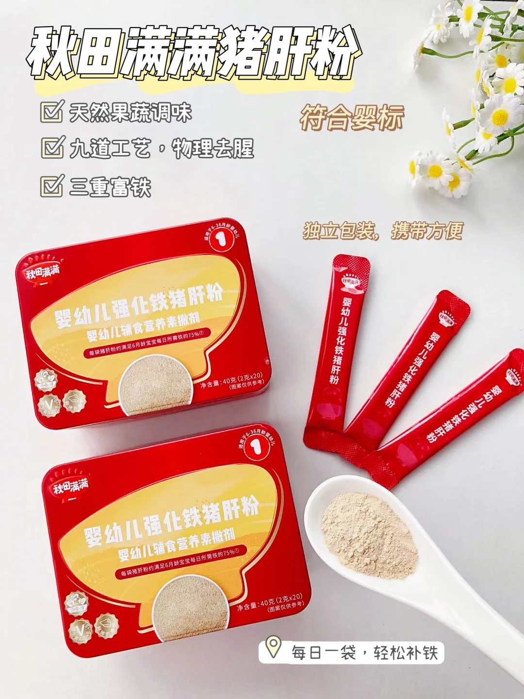 ✅我平时给宝宝做辅食,都会加点秋田满满的猪肝粉做为补充,因为铁对于宝宝来说真的是很重要的元素,而猪肝粉里就含有丰富的铁!秋田满满的这款猪肝粉,它的含铁量为408mg/100g,是多倍新鲜猪肝的含铁量,一袋猪肝粉可以很好的满足6月龄宝宝每日大部分的铁元素所需,它含有4种维生素,三重富铁,还有钙的全面升级,关键是一点也不腥,宝宝容易接受,营养好吸收,而且是新鲜猪肝磨粉的,符合婴幼儿标准,宝妈们可以放心选择哦~