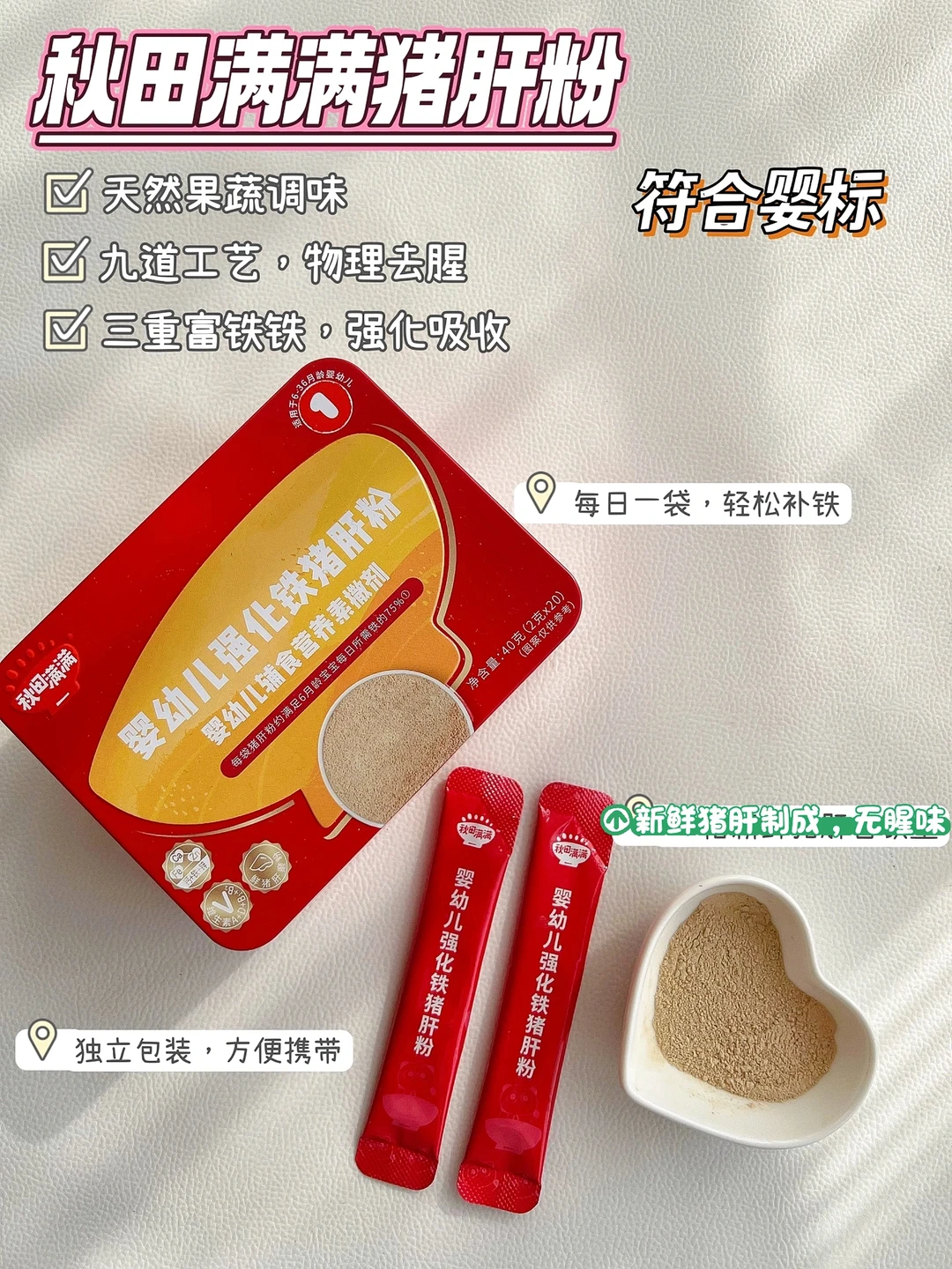 ✅我平时给宝宝做辅食,都会加点秋田满满的猪肝粉做为补充,因为铁对于宝宝来说真的是很重要的元素,而猪肝粉里就含有丰富的铁!秋田满满的这款猪肝粉,它的含铁量为375mg/100g,是多倍新鲜猪肝的含铁量,一袋猪肝粉可以很好的满足6月龄宝宝每日大部分的铁元素所需,它含有4种维生素,三重富铁,还有钙的全面升级,关键是一点也不腥,宝宝容易接受,营养好吸收,而且是新鲜猪肝磨粉的,符合婴幼儿标准,宝妈们可以放心选择哦~