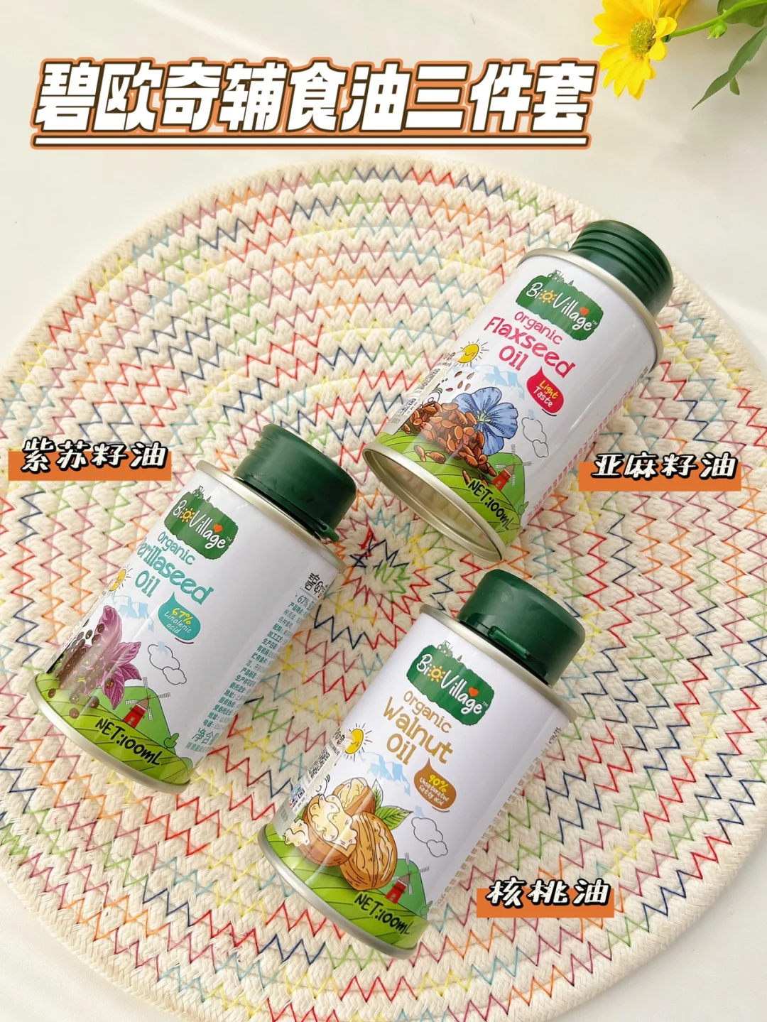 🥣给宝宝添加辅食,可以选择碧欧奇辅食油3件套,包含核桃油,亚麻籽油,紫苏籽油,3款油采用的都是避光金属罐装,避免光照,能更好的保留营养和辅食油的新鲜度。