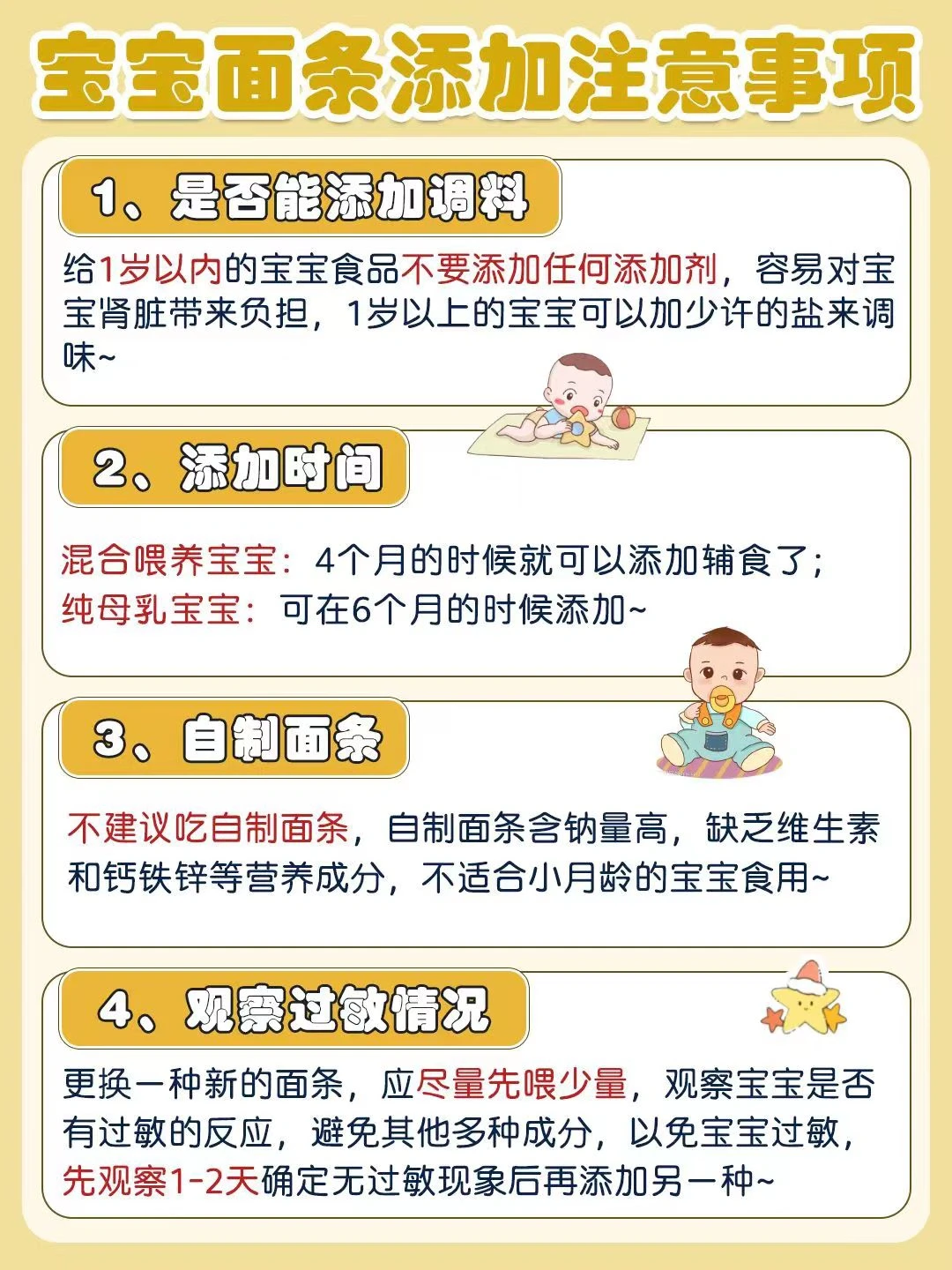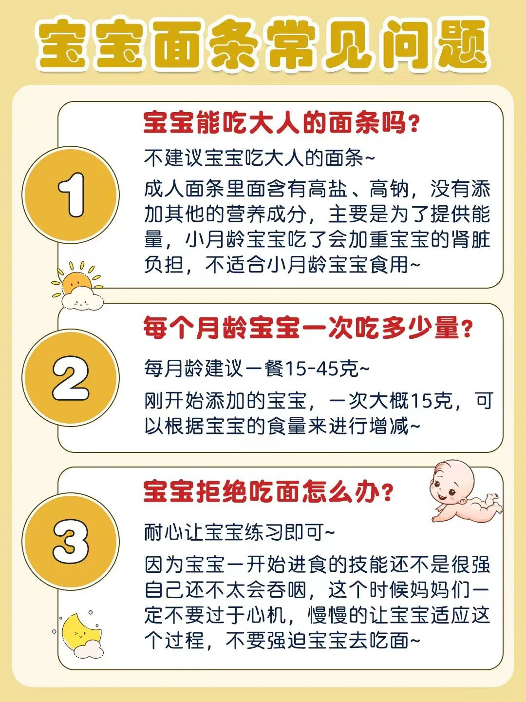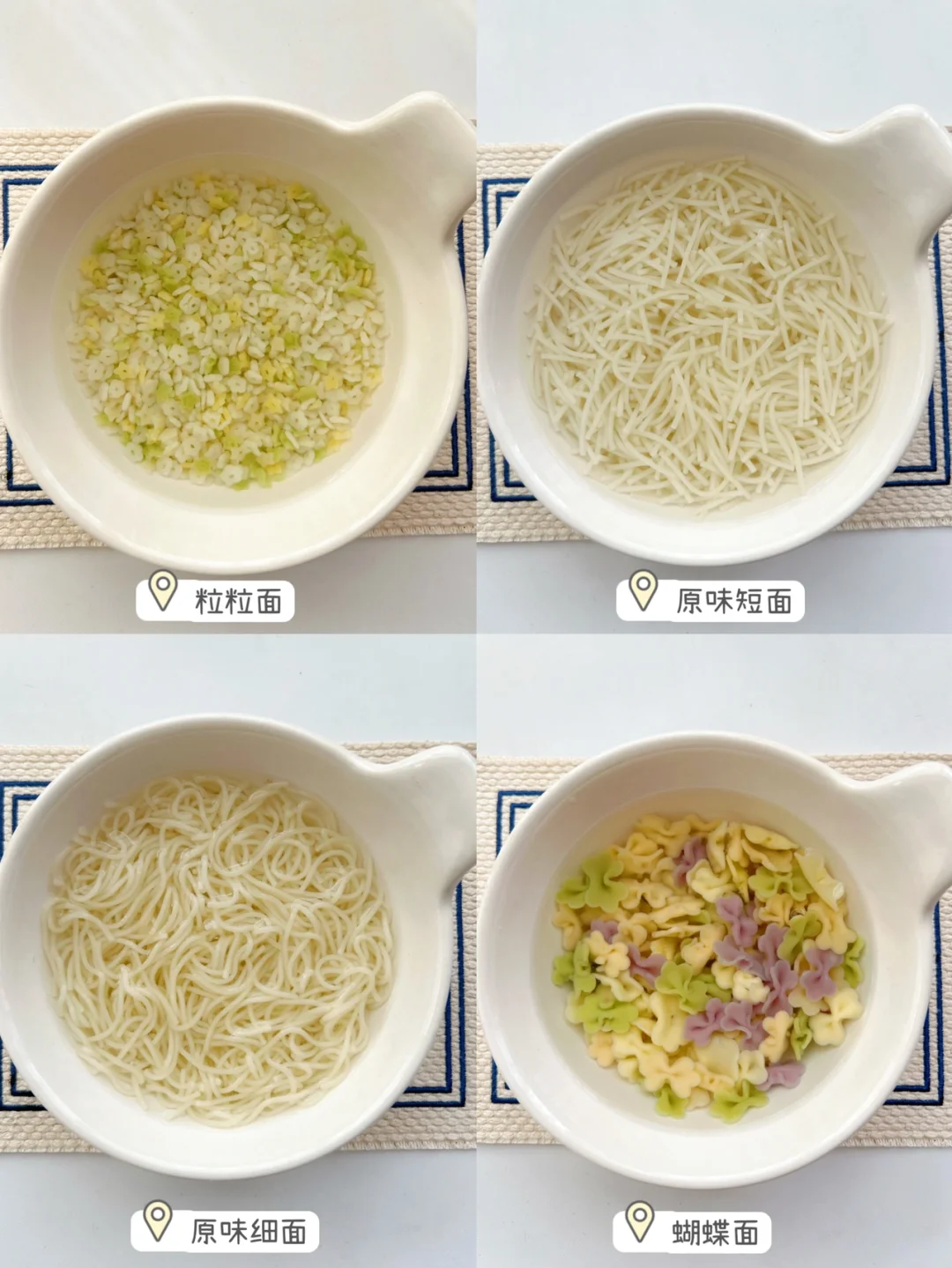 🔸市面上大部分宝宝面条都会明确标注满6个月以上就可食用了,但一般建议在吃米粉是1个月后就就可添加了,这个阶段的宝宝已经有了吞咽的基础,可以选择一些细碎的,慢慢过渡到小颗粒等比较容易吞咽消化的面条