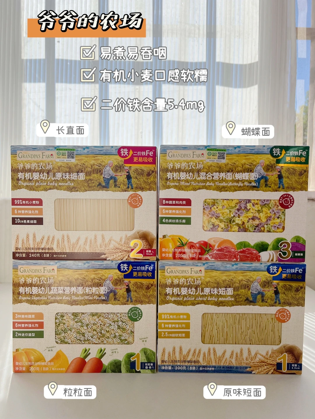 我家二宝初添加面条,吃的是爷爷的农场宝宝面条,他们家的面条种类多,对新手爸爸妈妈来说真的太友好了,不同月龄的不同造型都有,它家的铁含量很高,有5.4mg,还是二价铁,有机小麦很好煮,三分钟就煮好了,不糊锅,宝宝可喜欢吃了,每次都吃光光,独立包装,用起来更方便,不用担心面条发潮啦~~
