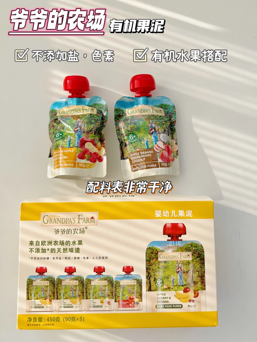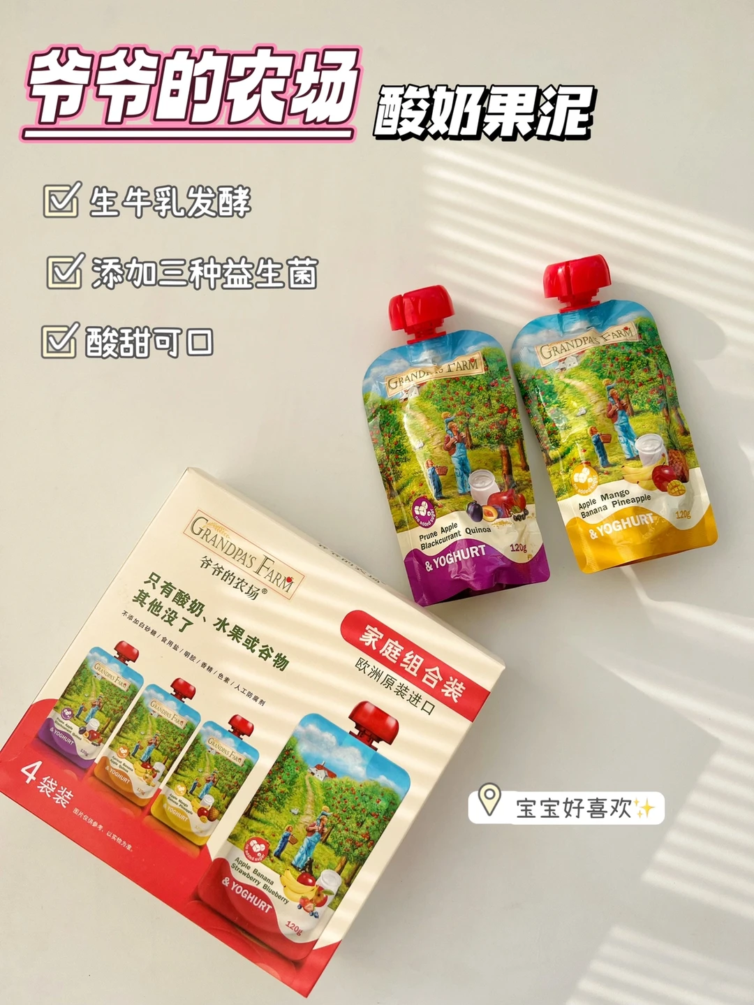 🥣我家宝宝6月龄添加果泥的时候吃的是爷爷的农场有机果泥,配料表很干净,只有多种水果搭配,口感很细腻,性价比很高,宝宝月龄大了之后,就可以添加爷爷家的酸奶果泥了,生牛乳发酵,添加三种益生菌,口感酸酸甜甜的,宝宝很爱吃,他家两款都是小袋独立包装,外出携带也很方便~